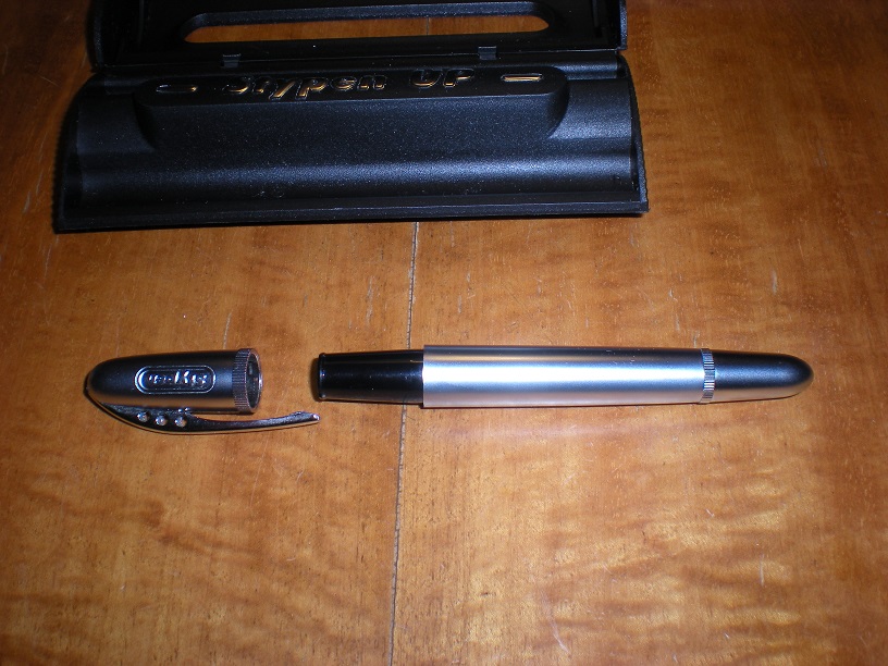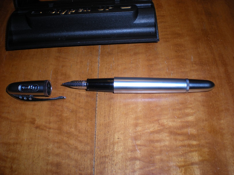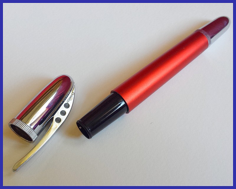 Si tratta di una stilografica da taschino, piccolissima ed estremamente "divertente". E' dotata di un meccanismo inserito nel fusto della penna che consente al pennino di scomparire letteralmente nel corpo della penna stessa. Un pennino retrattile, a scomparsa che rappresenta quasi un unicum nel genere. Quindi tutto sommato ha come caratteristica e peculiarità la grande portabilità e un costo davvero economico. Al tempo credo di aver speso poco più di 10 euro.