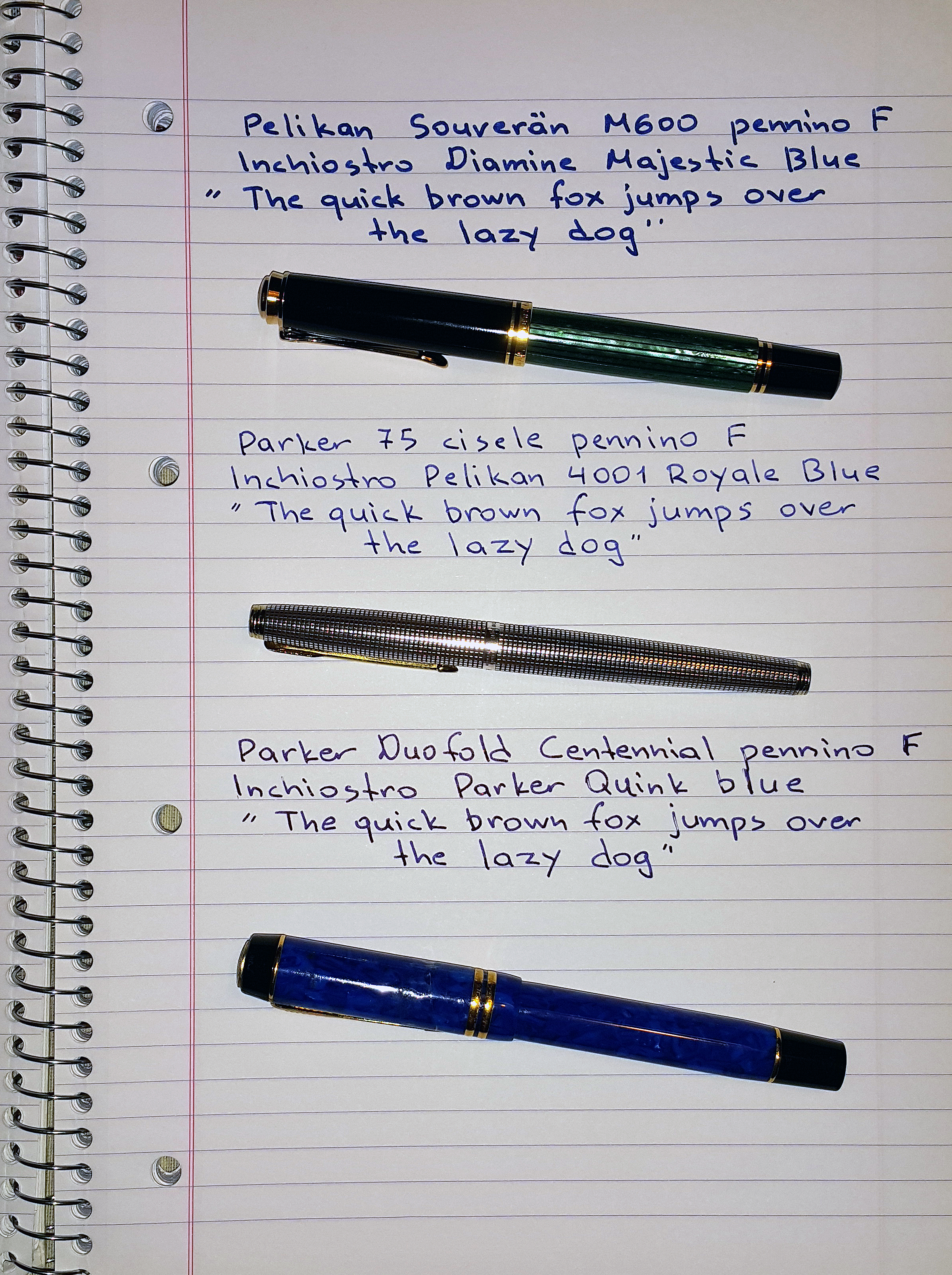 Le mie tre "F" penne. Pelikan M600, Parker 75 e Parker Duofold Centennial. La differenza di scrittura è enorme, Pelikan sembra con una "B". E inoltre non c'è alcun segno "F" sul pennino. E' normale?
