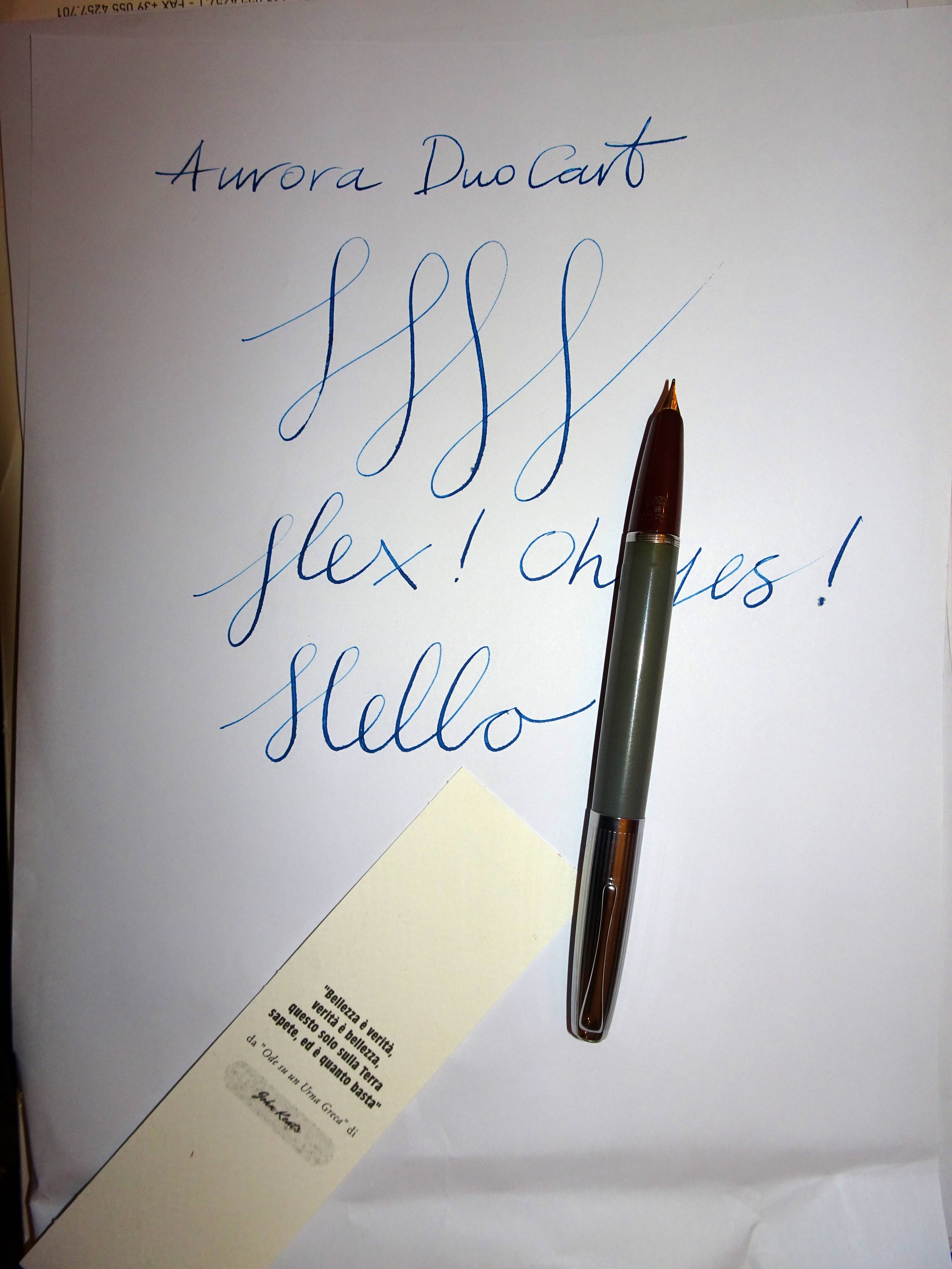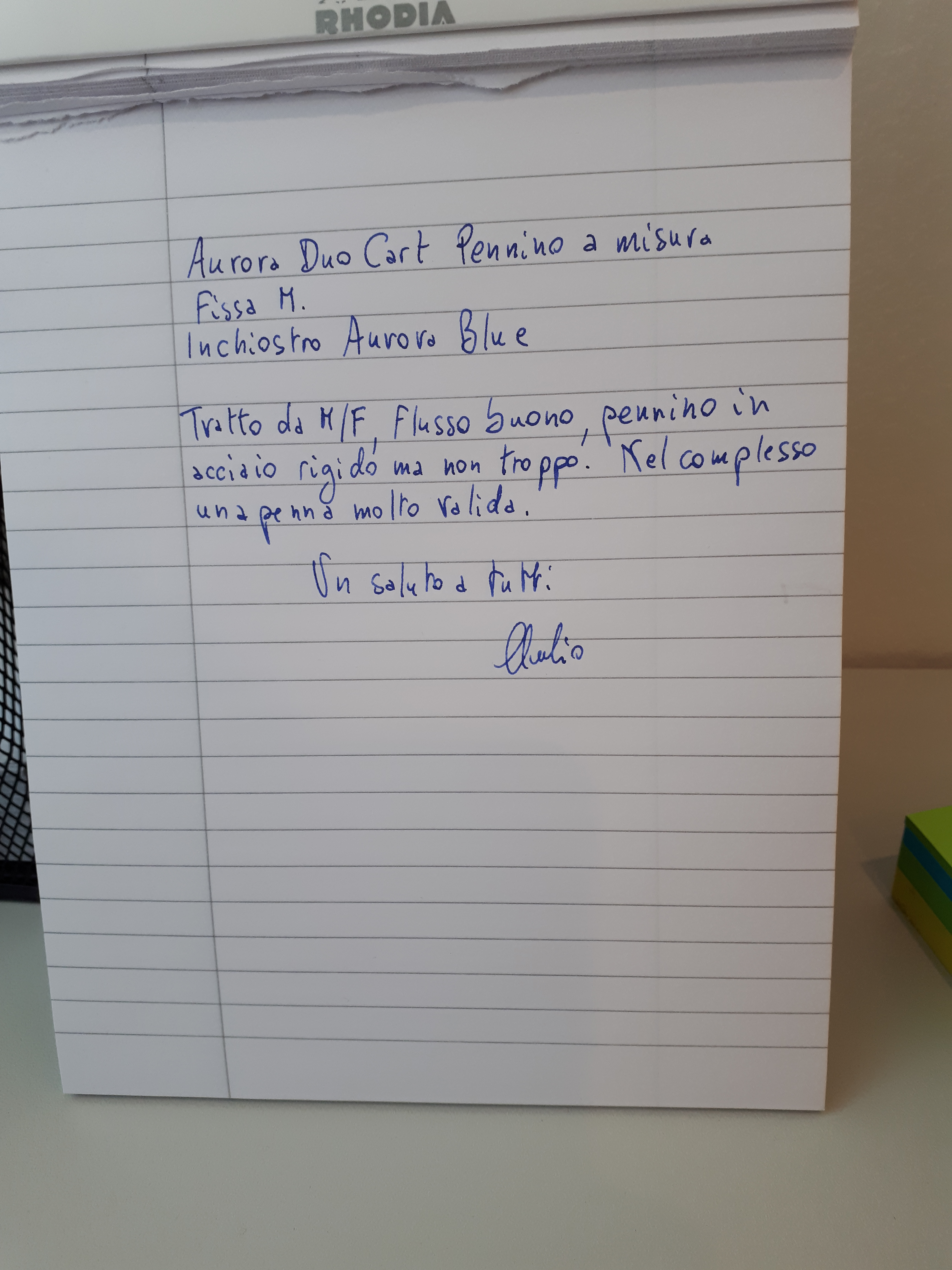 Scrittura: il pennino in acciaio viene fornito in una unica misura, che io definisco un M/F pulito, preciso, che rilascia un tratto che su carta Rhodia 80/mg è fine, e su carta da fotocopie un po' più largo. Il flusso è buono, e al momento non ho riscontrato nessun problema utilizzando l'inchiostro Aurora Blue, inchiostro tra l'altro che non avevo mai provato e che trovo eccellente.