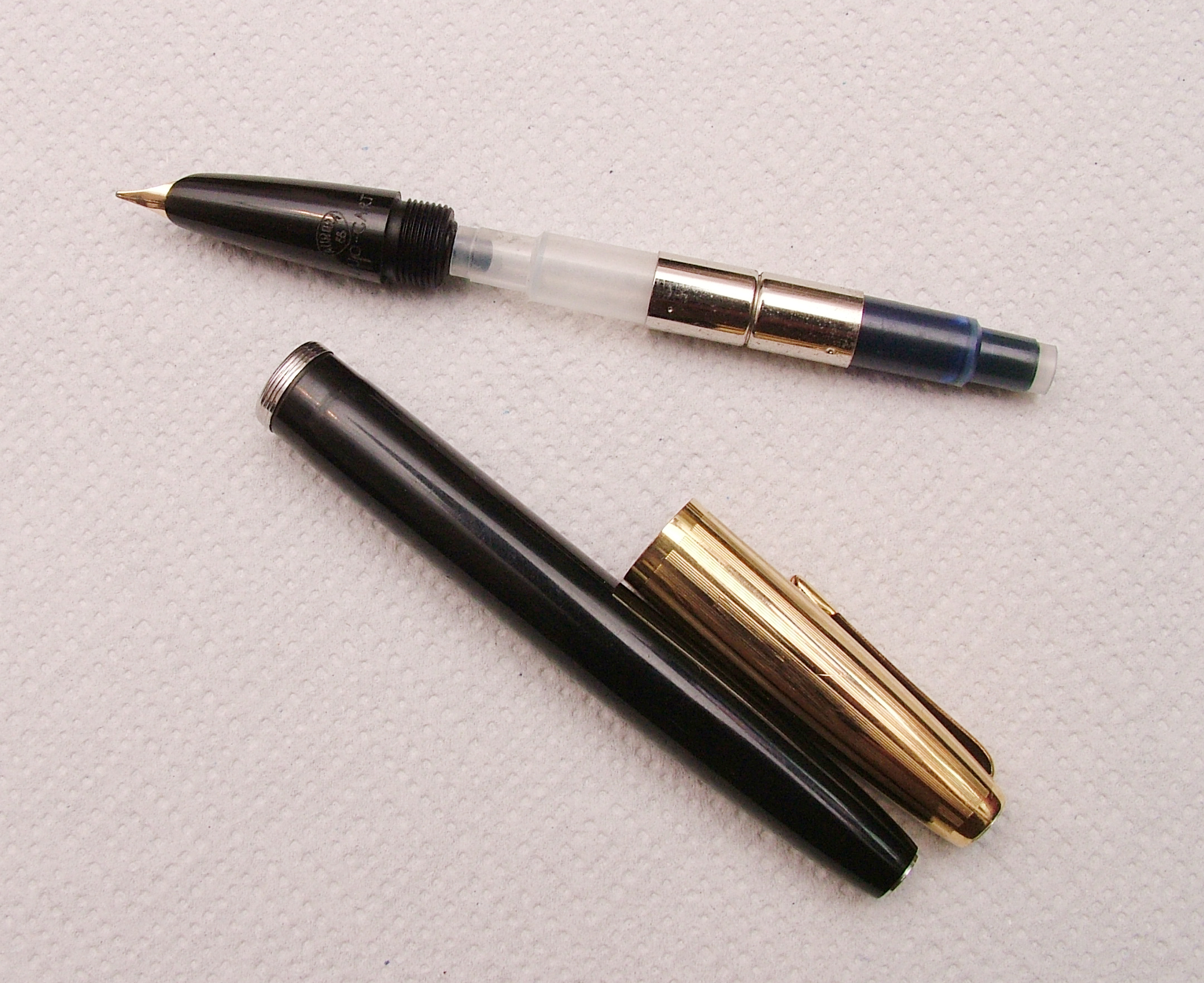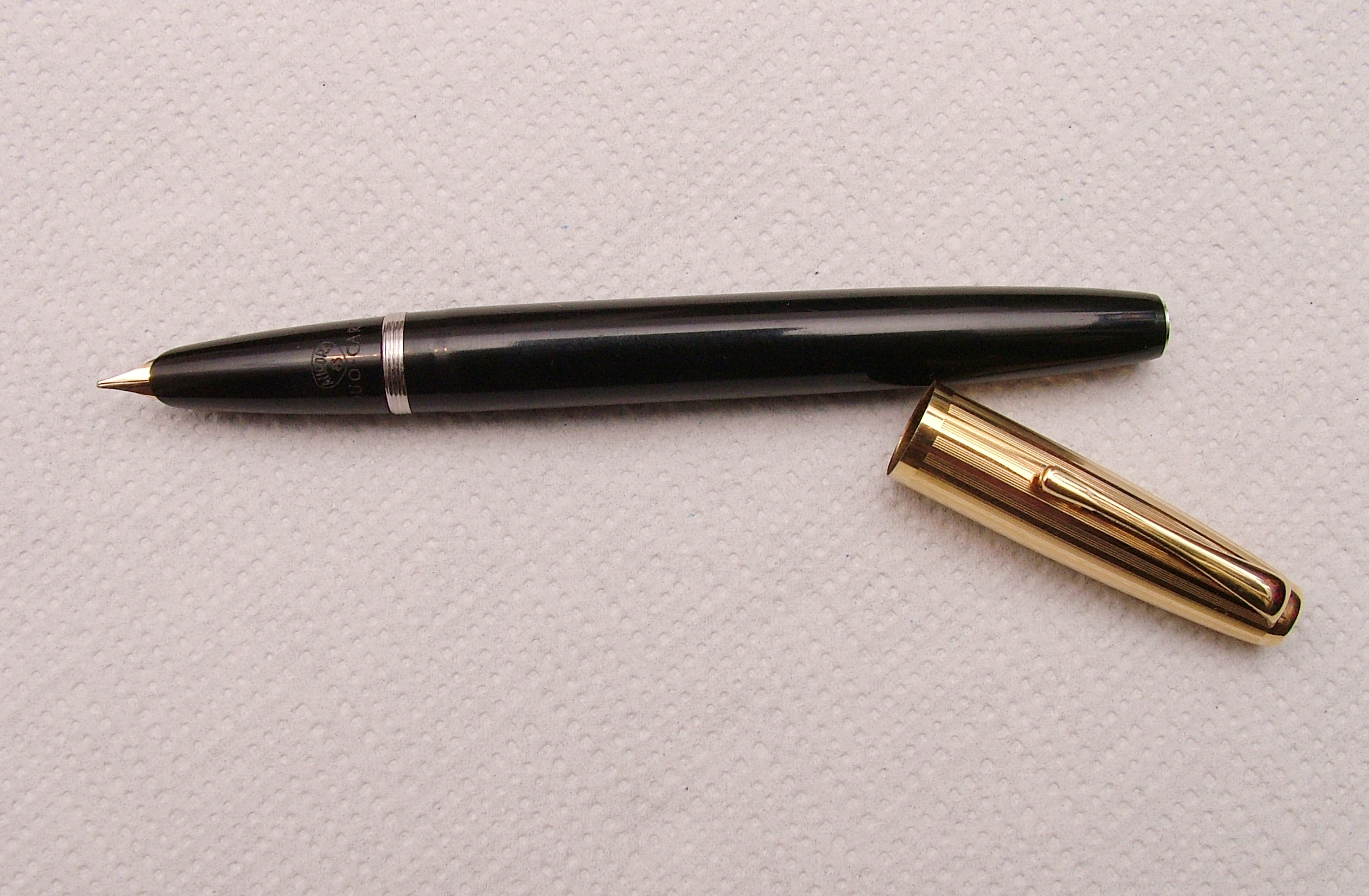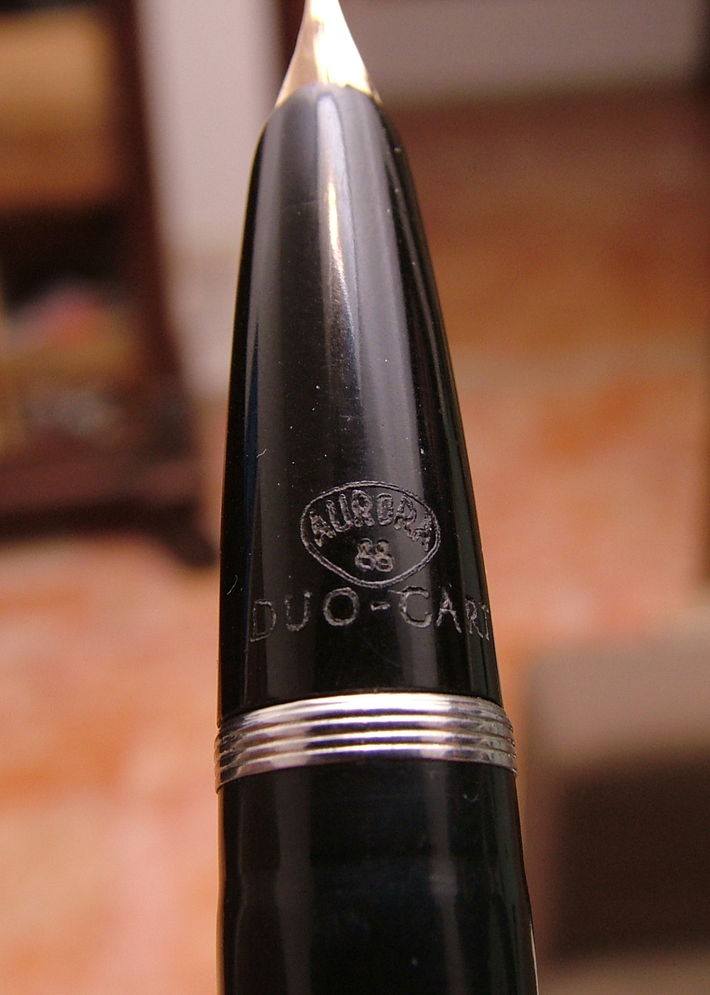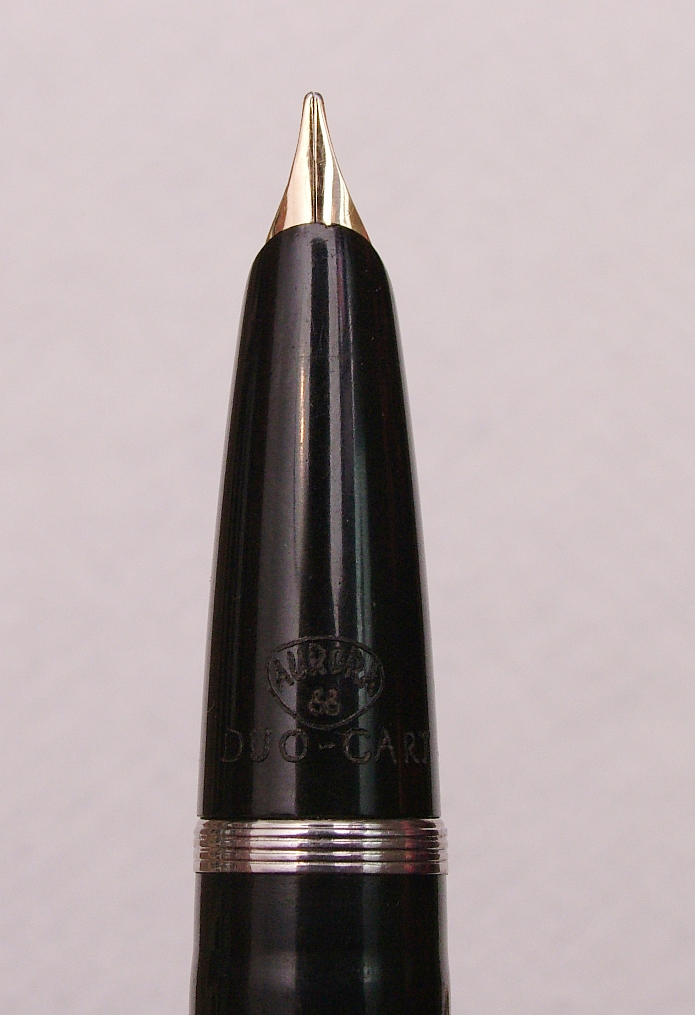 La penna che ho io e che vedete è quella nero-bordeaux con cappuccio dorato. Ne esiste un'altra versione nera con cappuccio cromato. Da quanto ho letto in rete le Duo Cart vintage riportavano impresso sul gruppo scrittura la dicitura " Aurora 88 Duo Cart", cosa assente sui nuovi modelli. Il nome "Duo Cart" deriva dal fatto che si potevano inserire all'interno della penna due cartucce, una per scrivere e una di riserva. Le attuali cartucce Aurora standard ovviamente non prevedono tale possibilità.