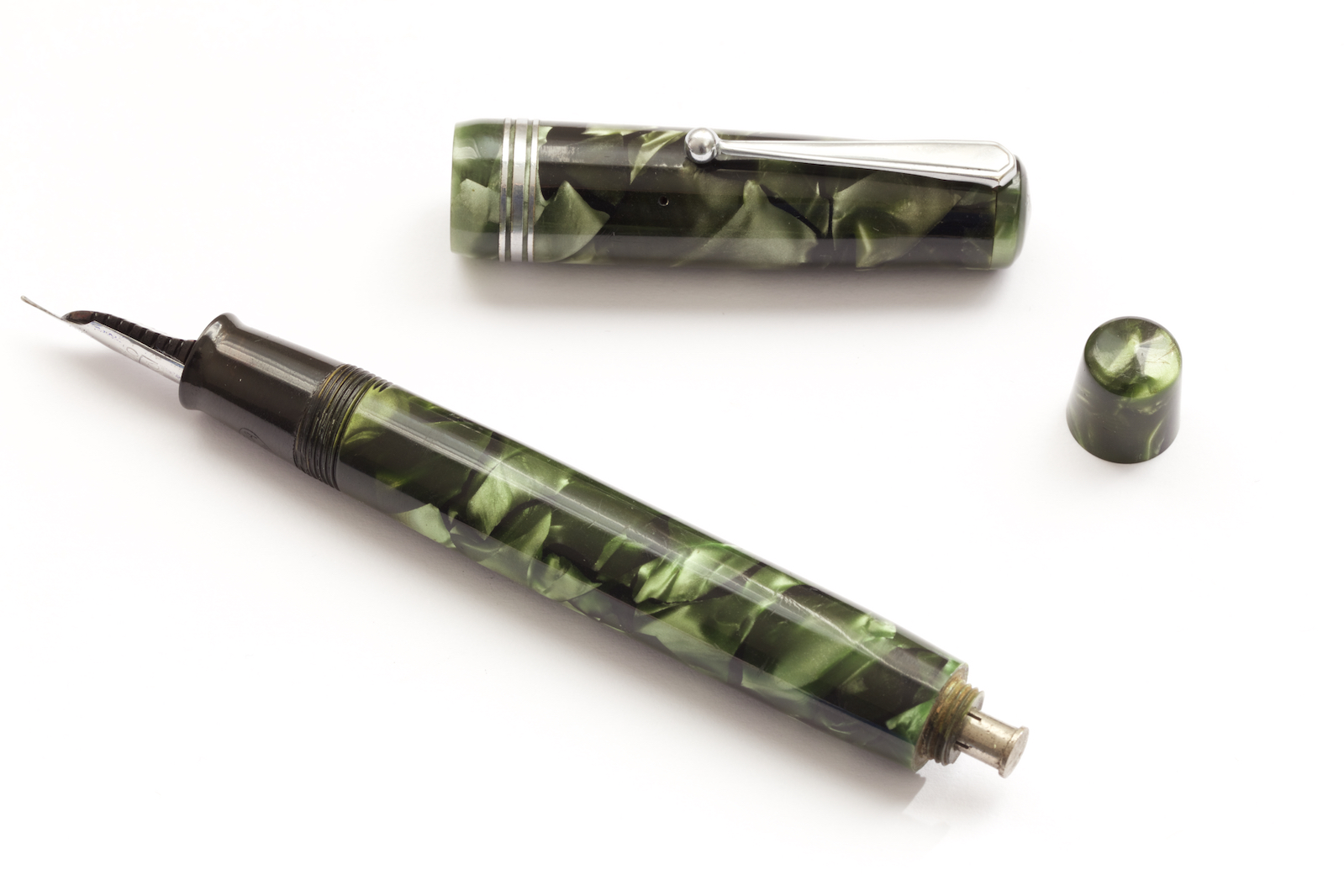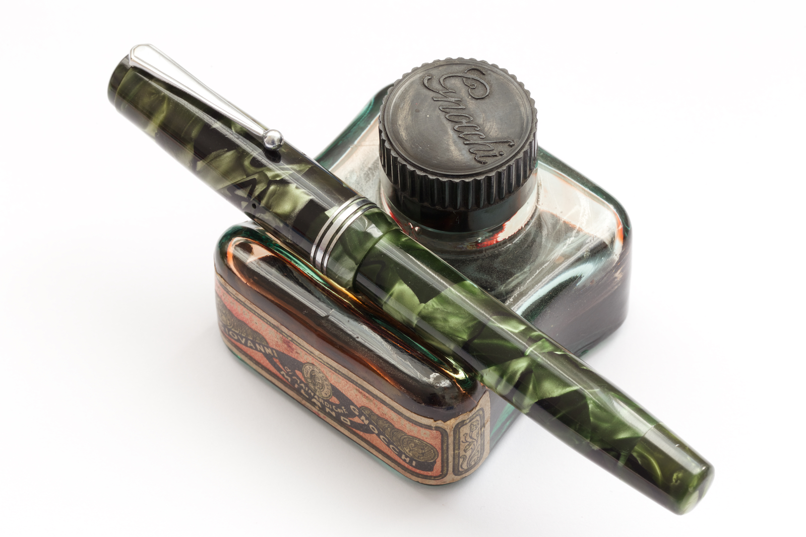 Oggi vi presento una delle ultime arrivate, l' Aurora Selene. Dalla veretta centrale più larga rispetto le altre dovrebbe appartenere alla prima serie del 1939-1940. Viene definita un modello economico ma osservando la qualità della celluloide e il bellissimo pennino in Platiridio vorrei che anche le economiche di oggi fossero così....La carica avviene tramite pulsante di fondo, coperto da un fondello dello stesso colore del corpo della penna, il pennino è molto fine e dotato di buona flessibilità che permette certi svolazzi. La misura della penna non è esagerata, chiusa 128 mm, abituato a penne generose calza comunque bene in mano. Sulla sezione si trova il "punzone" Aurora Selene.