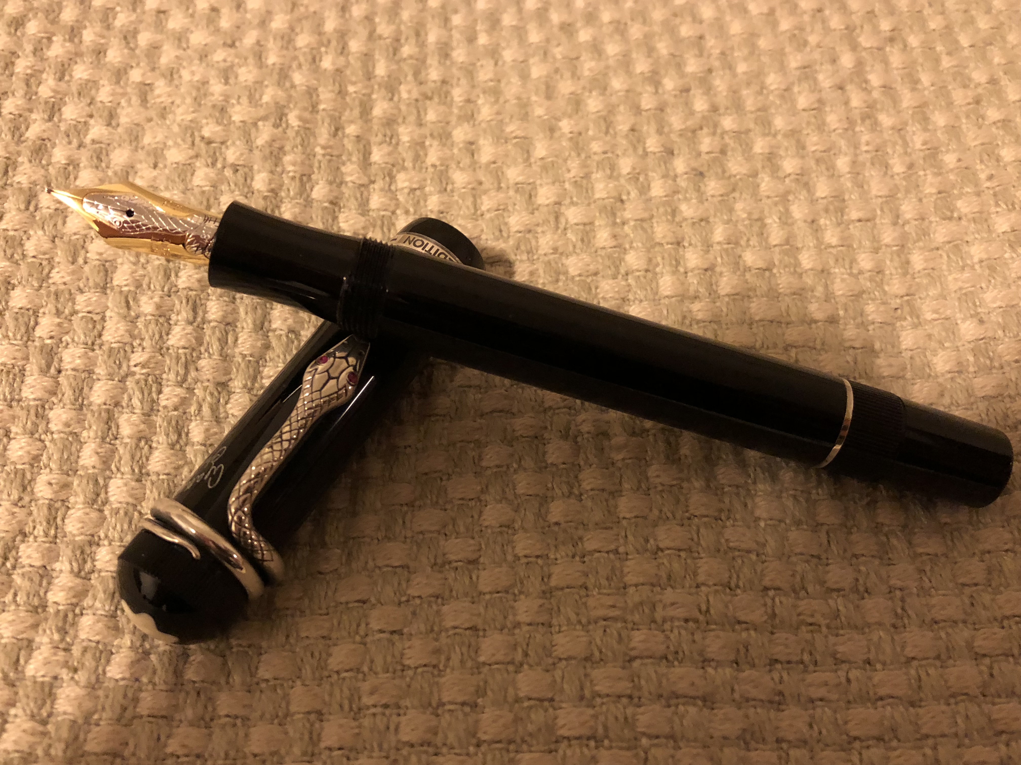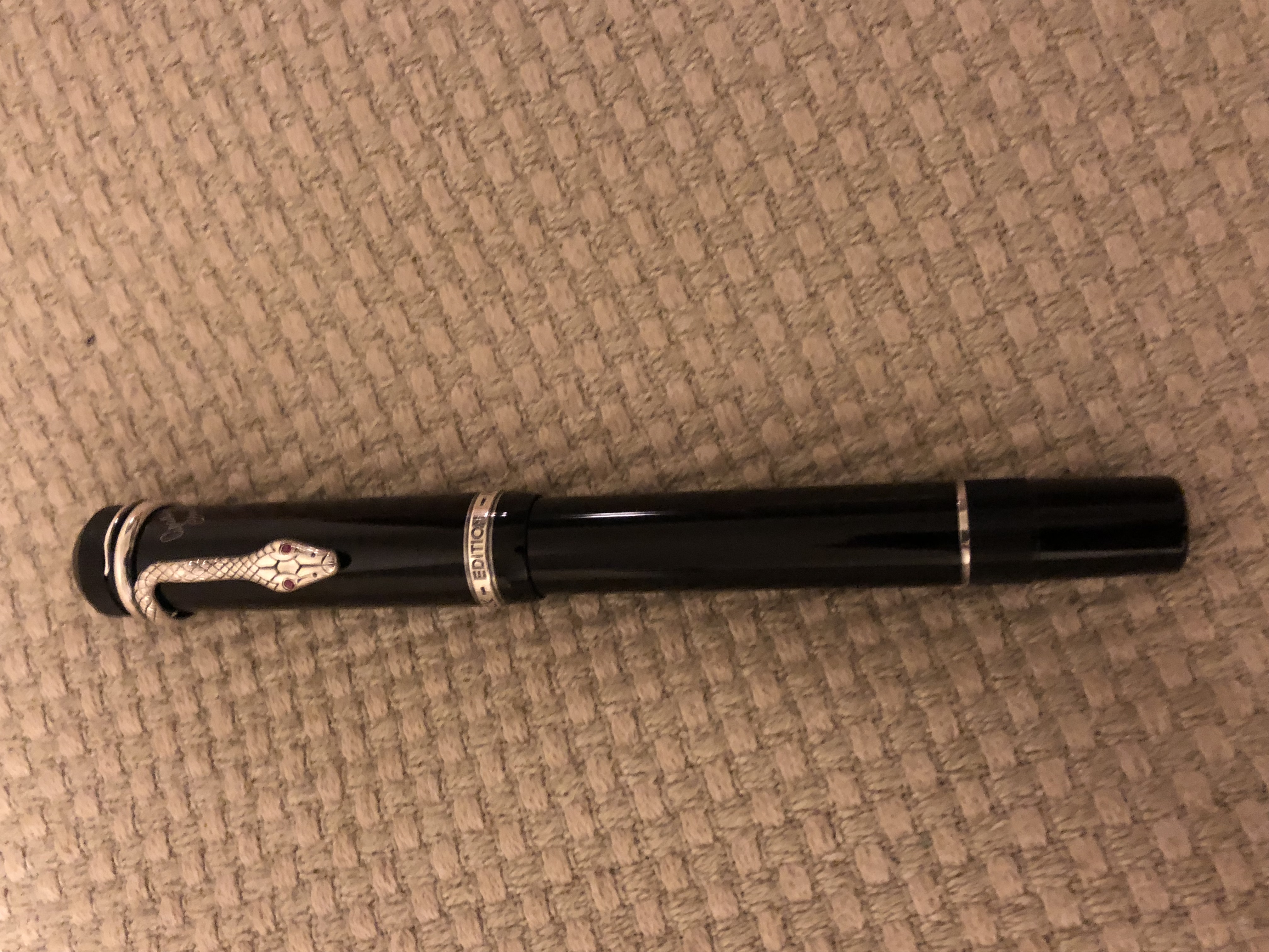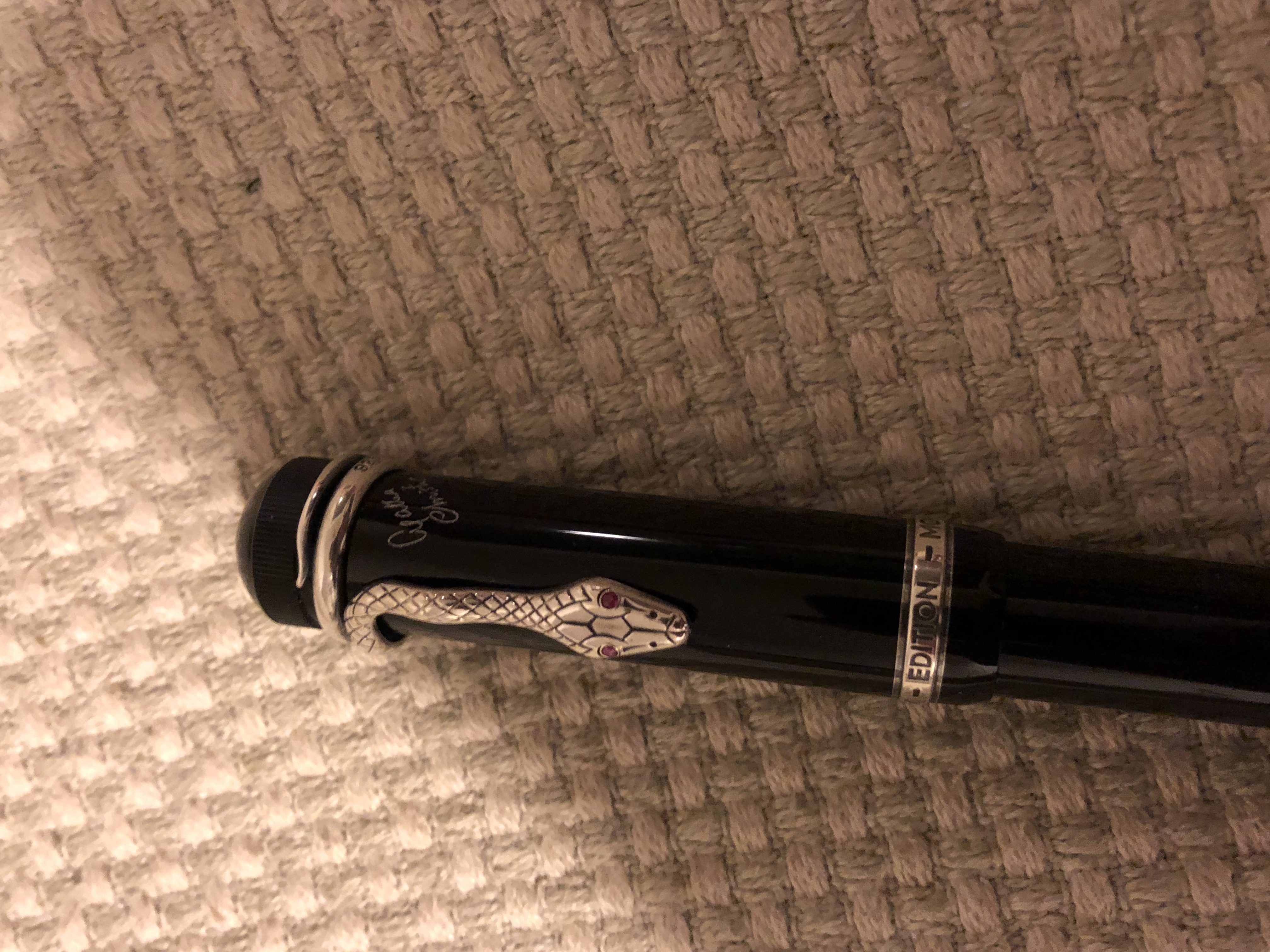La "Agatha" mostrata in foto ha delle pietre rosse ("rubini" secondo MB) al posto degli occhi del serpente; SE avesse avuto gli "occhi" color zaffiro sarebbe stata una L.E. da 4810 esemplari; avendo gli occhi in "rubino", fa parte della serie prodotta in 30.000 esemplari (23.000 stilografiche e 7.000 set composti da stilo, sfera e portamine).