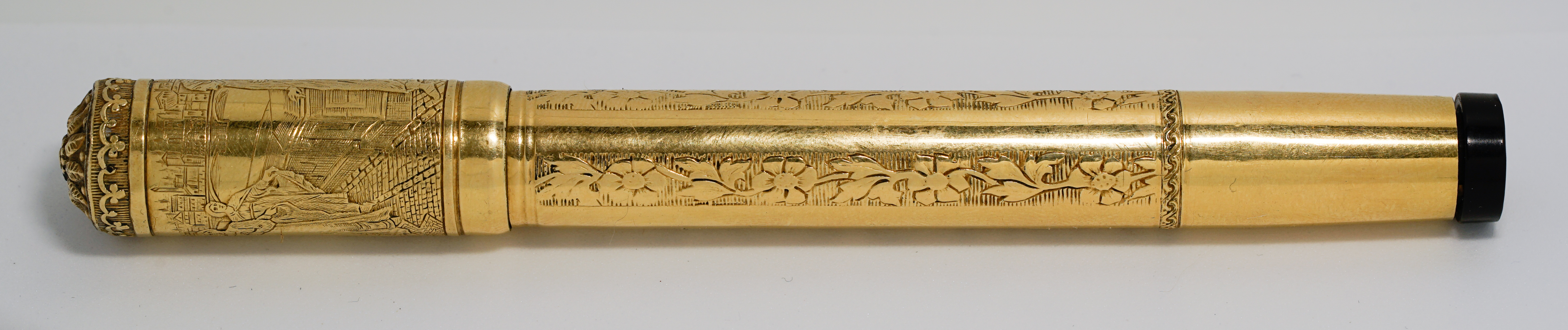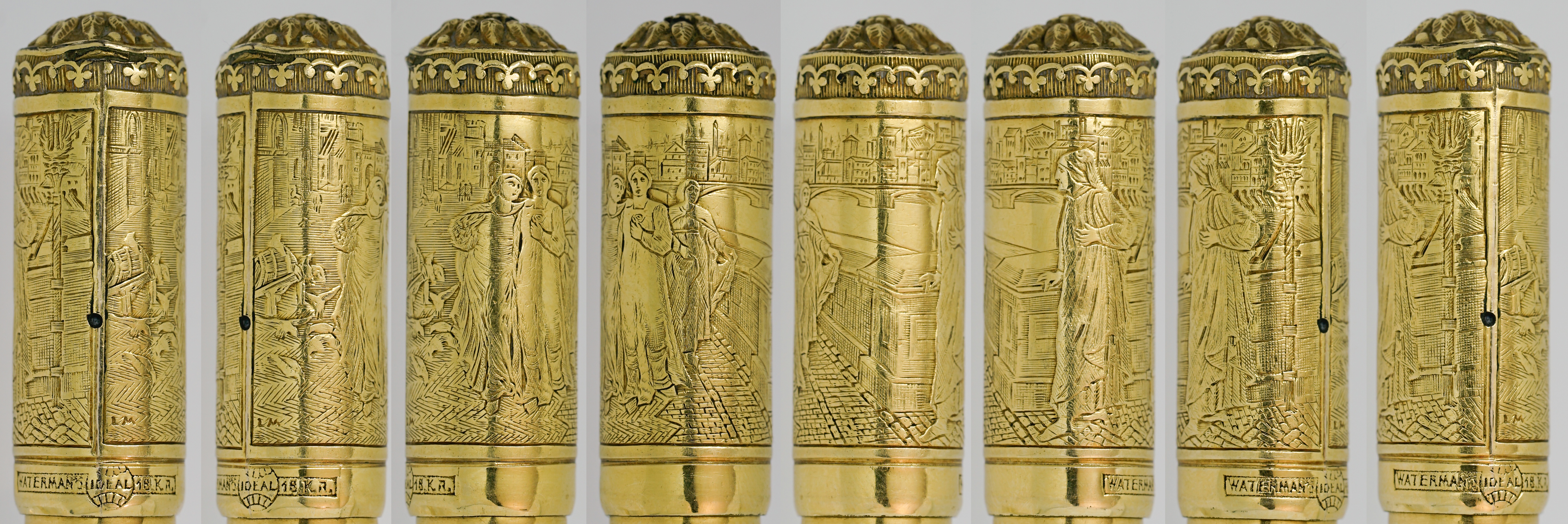 Si tratta di una Waterman 42 di produzione F.lli Cavaliere che riporta sul cappuccio la riproduzione del quadro del pittore preraffaellita Henry Holiday "Dante e Beatrice".