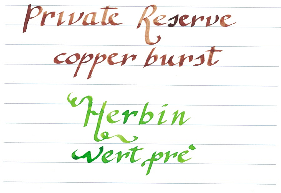 Il Copper Burst della Private Reserve ha un color ruggine bellissimo , idem per l'Herbin verde che risulta forse eccessivamente bagnato ma ha una brillantezza notevole...li ho provati su penne dal flusso magro e risultano piacevolissimi
