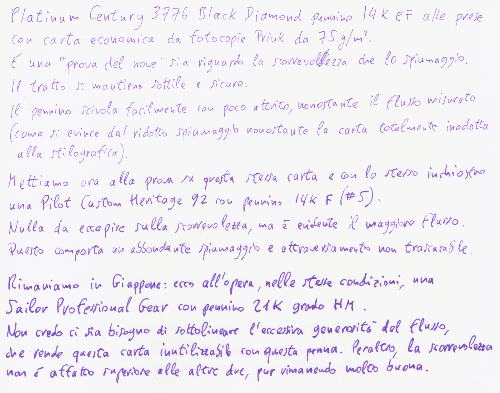 Per dire: nel confronto qui sopra, con la EF ho avvertito una scorrevolezza almeno pari a quella della Pilot 92 con pennino 14K F, nonostante questa sia caratterizzata da un flusso visibilmente più generoso.