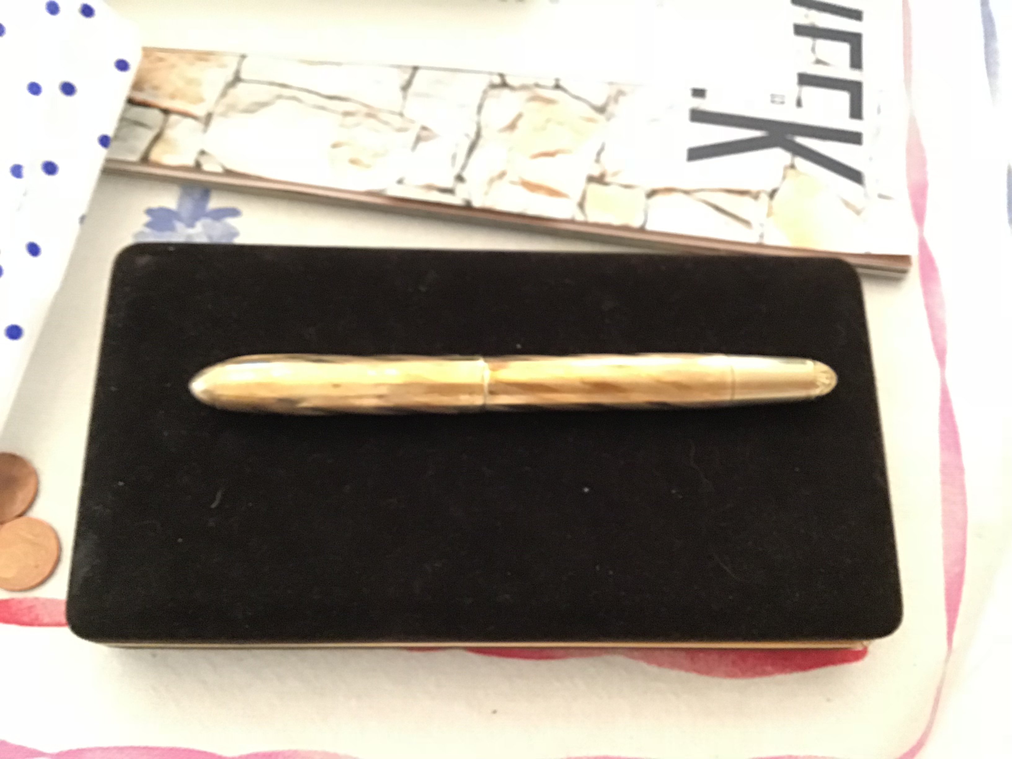 Non si riesce a capire che marca e modello sia: apparentemente simile a un’Aurora 98, non presenta però le indicazioni relative né sulla clip, né in altre parti del corpo penna. Si direbbe a stantuffo, ma il fondello non gira né si sfila in altro modo.