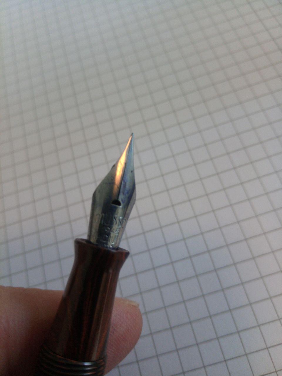Il pennino e' uno fatto fare (presumo, qui non ho trovato molto) dalla Musso Stilografiche, fu cartoleria storica a Torino, nel dopo guerra visto che riporta lo sbalzo "Musso 1945 Iridium Extra", l'unica altra cosa che sono riuscito a scoprire di questo pennino e' che ne fu fatta una versione d'oro credo a 18k e tutti e due i tipi sono molto flessibili.