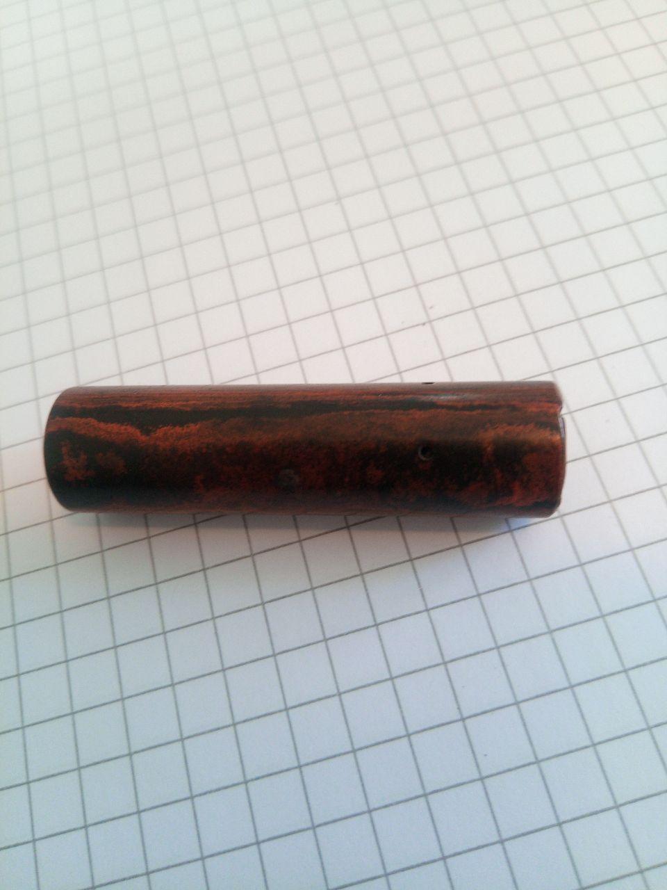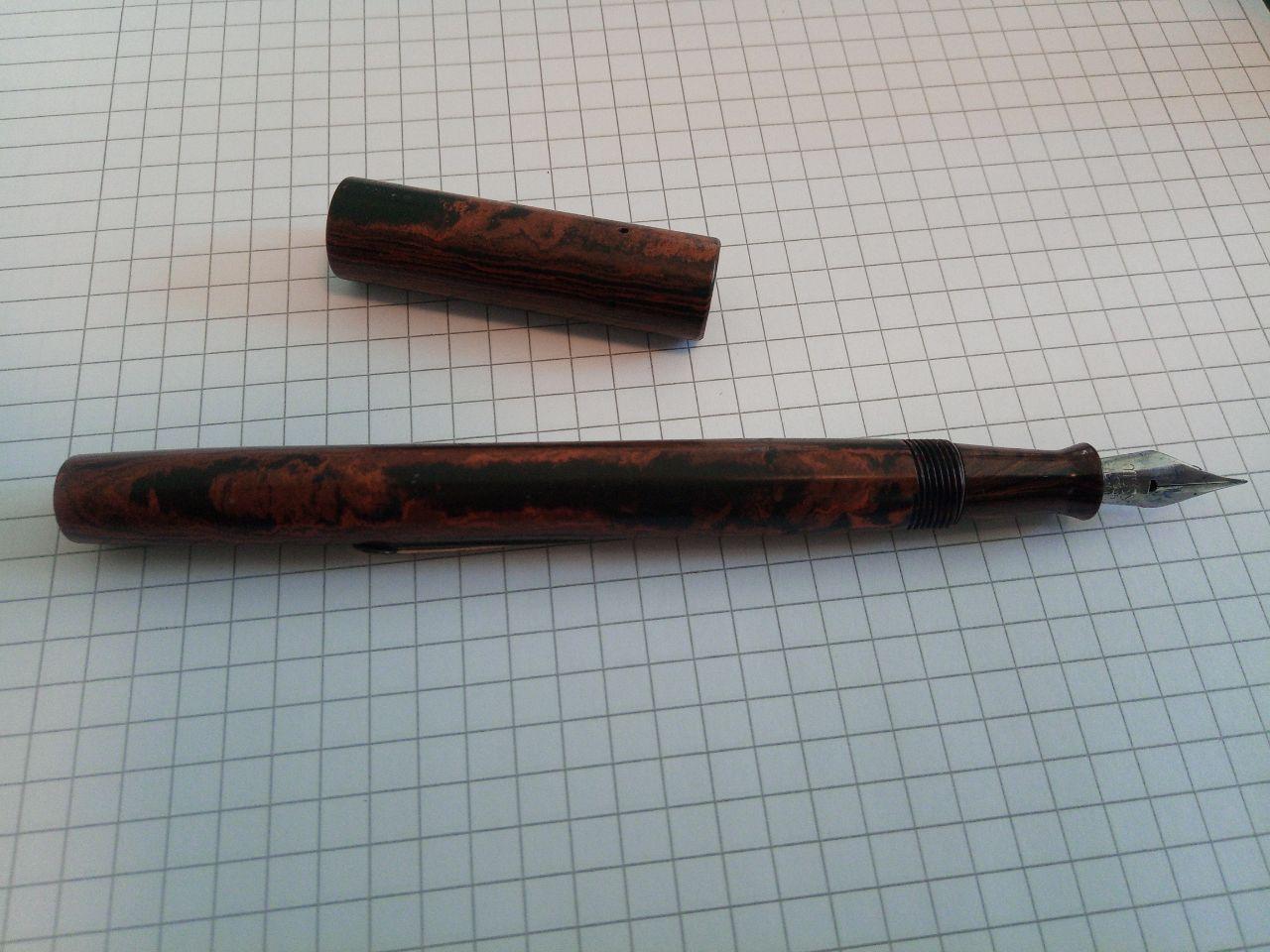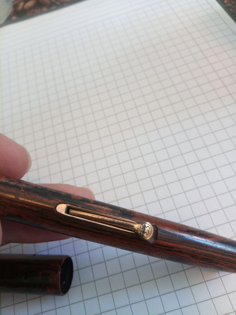 E' tutta in finta radica (l'apparenza e' quella), caricamento a levetta, cappuccio a vite, nessun segno di riconoscimento su sezione, corpo o cappuccio. Il cappuccio pero' ha quattro fori disposti a 90 gradi tra loro che non capisco a che possano essere serviti, faccio un azzardo e dico che potevano tenere qualche fregio di sorta, poi caduto o anche a clip visto che la penna ne e' sprovvista.