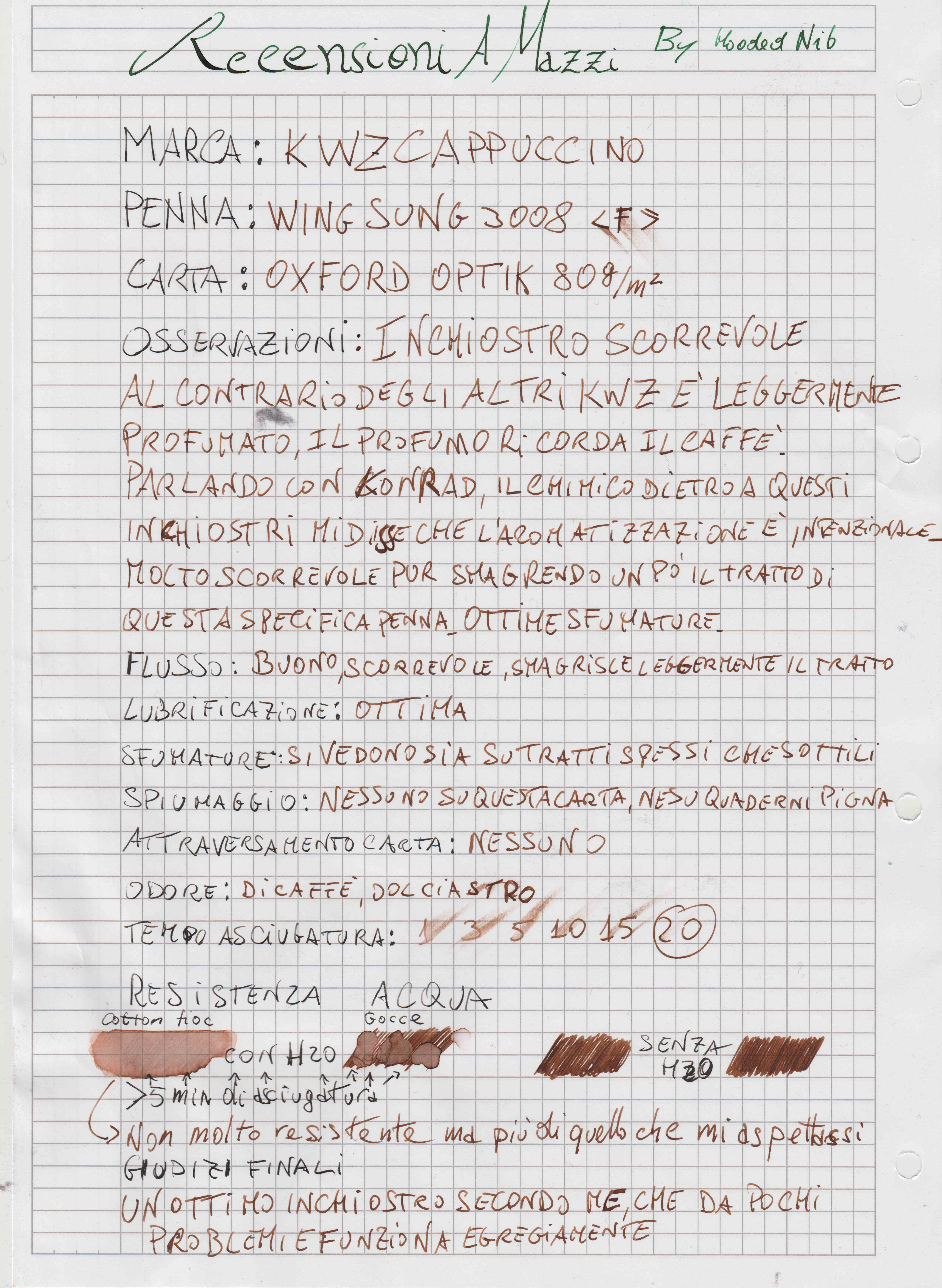 Nota sull'odore, tutti i KWZ hanno un odore particolare, Konrad spiega in ogni dove che e' dovuto ai conservanti che usano, i quali conferiscono un odore dolciastro e/o di "disinfettante" (che poi e' quello che devono fare questi additivi. A differenza di altri inchiostri della linea questo e' anche leggermente aromatizzato (credo non sia il solo), e su specifica mia domanda sulla pagina FB di KWZ ho avuto risposta che e' di proposito che questo inchiostro sa di caffe' all'olfatto, e si sente in scrittura. Trovo la cosa molto piacevole.