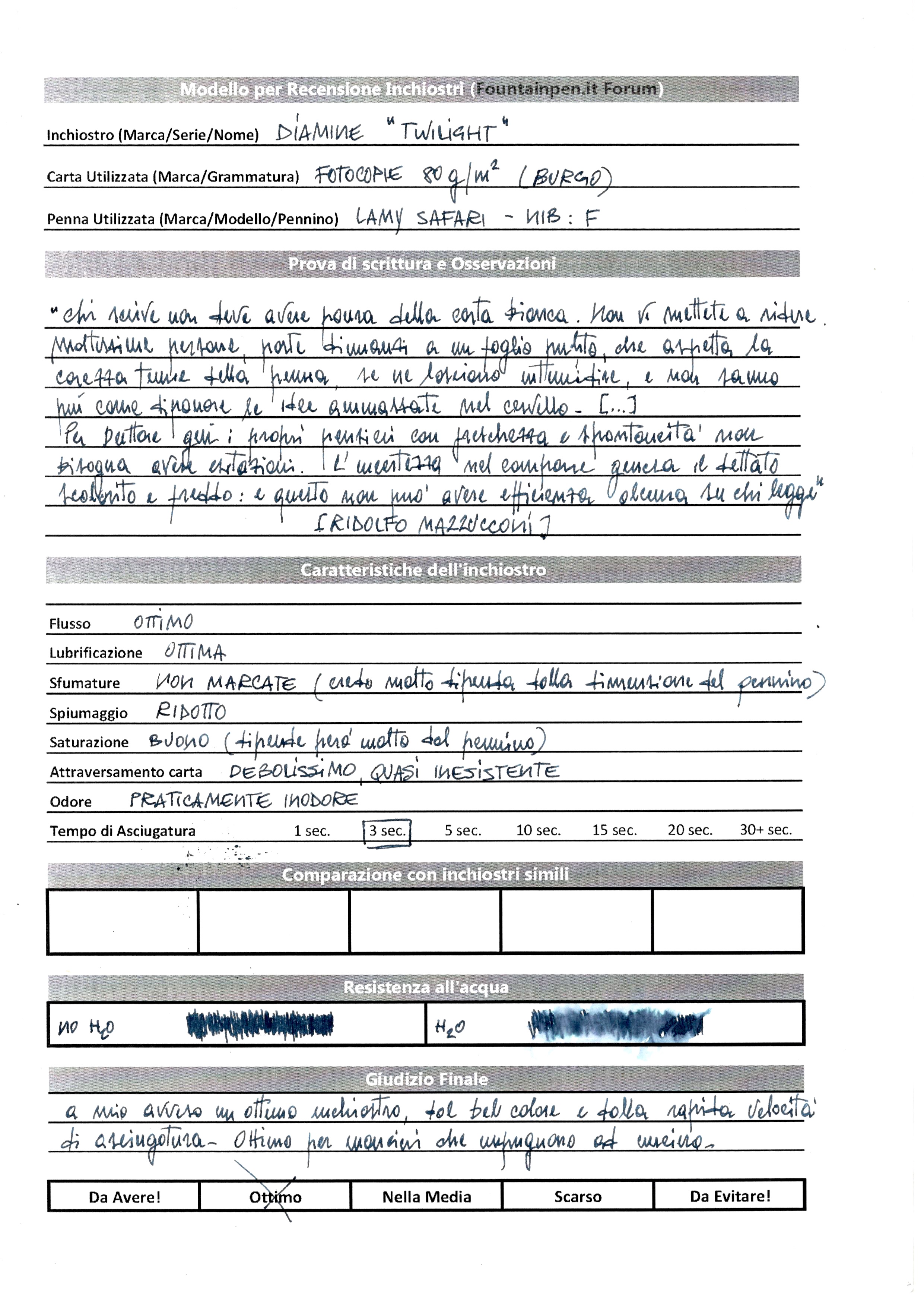Sono un neo-iscritto al forum e guardo sempre con fascino alle recensioni degli inchiostri. Un magico mondo fatto di sfumature a cui per la prima volta mi avvicino anche io. Fino a 2 mesi fa la stilografica era lontanissima dalla mia vita quotidiana e ora...non potrei vivere senza!