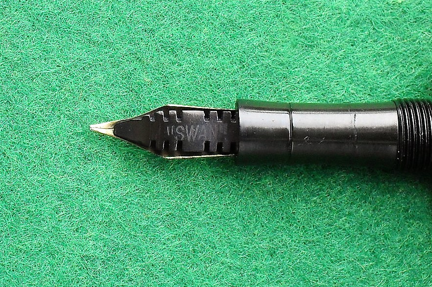 Il pennino è un classico Swan n. 2 flessibile con punta media, eccellente e molto piacevole da usare, sorretto benissimo nelle sue prestazioni da un alimentatore in ebanite che assicura un flusso mai magro, anche quando la flessibilità del pennino viene utilizzata senza risparmio.
