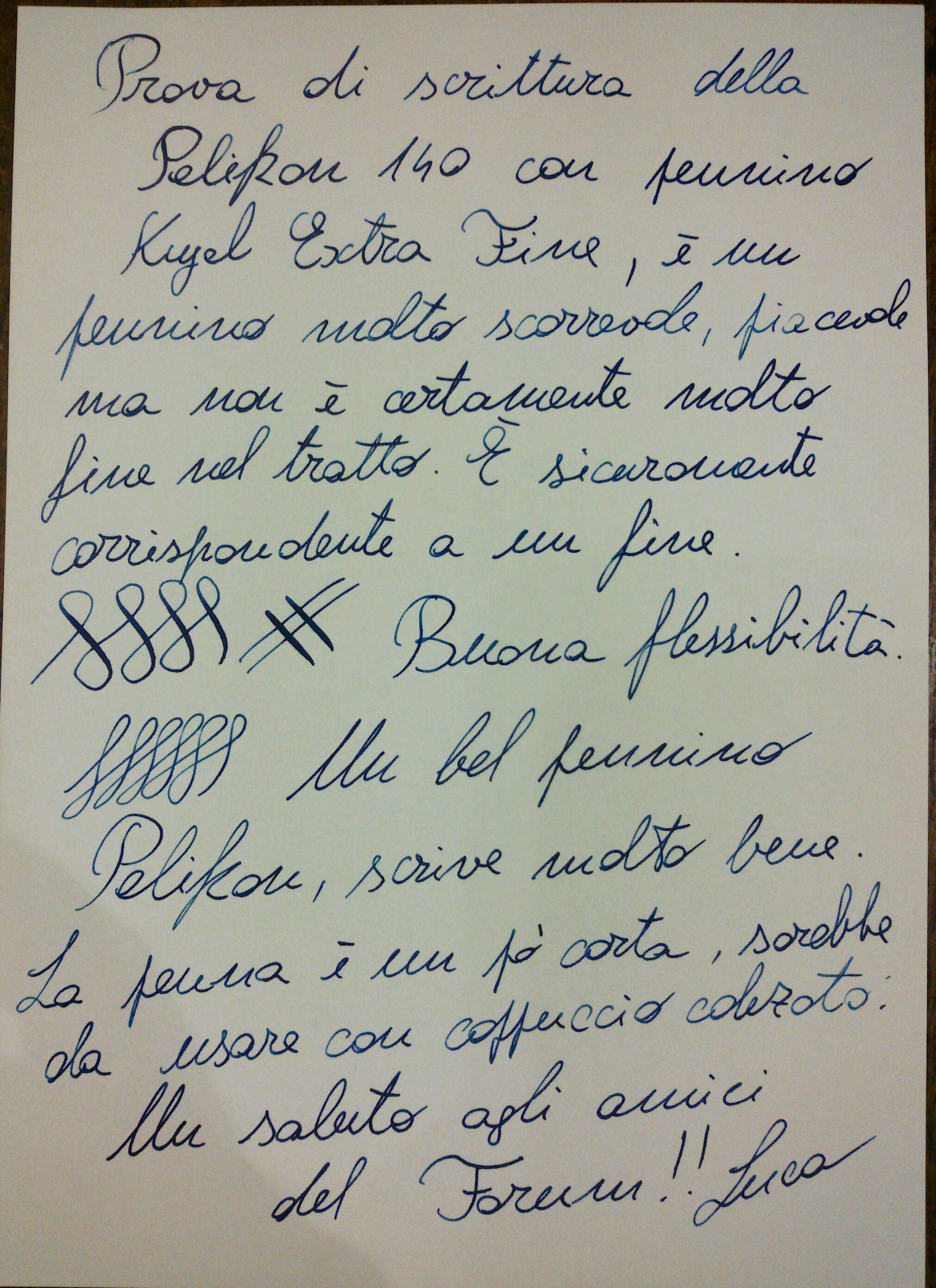 Allego la prova di scrittura, un bel pennino flessibile e scorrevole, che sia Kugel non ho notato particolari cambiamenti rispetto un fine "normale".