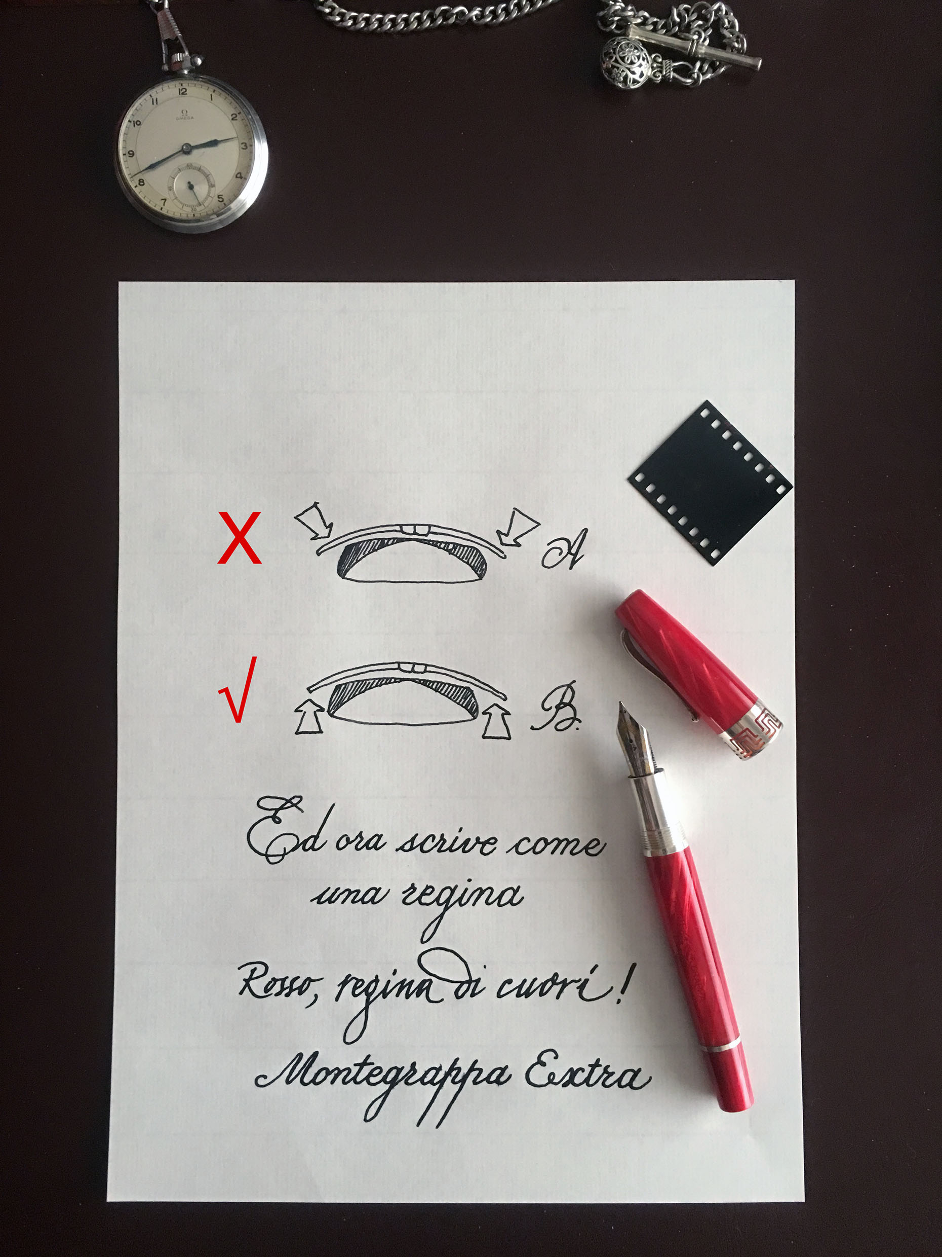 Allora ho provato con l'azione contraria, facendo pressione sui bordi delle ali verso l'alto, per cosí dire "appiattendo" leggermente la curvatura trasversale del pennino (figura B). Et voila! Il "tic" é scomparso e il pennino scrive ora con quella dolcezza che é tipica dei pennini Montegrappa, che non sono flessibili ma "morbidi" ed elastici. Fantastico!