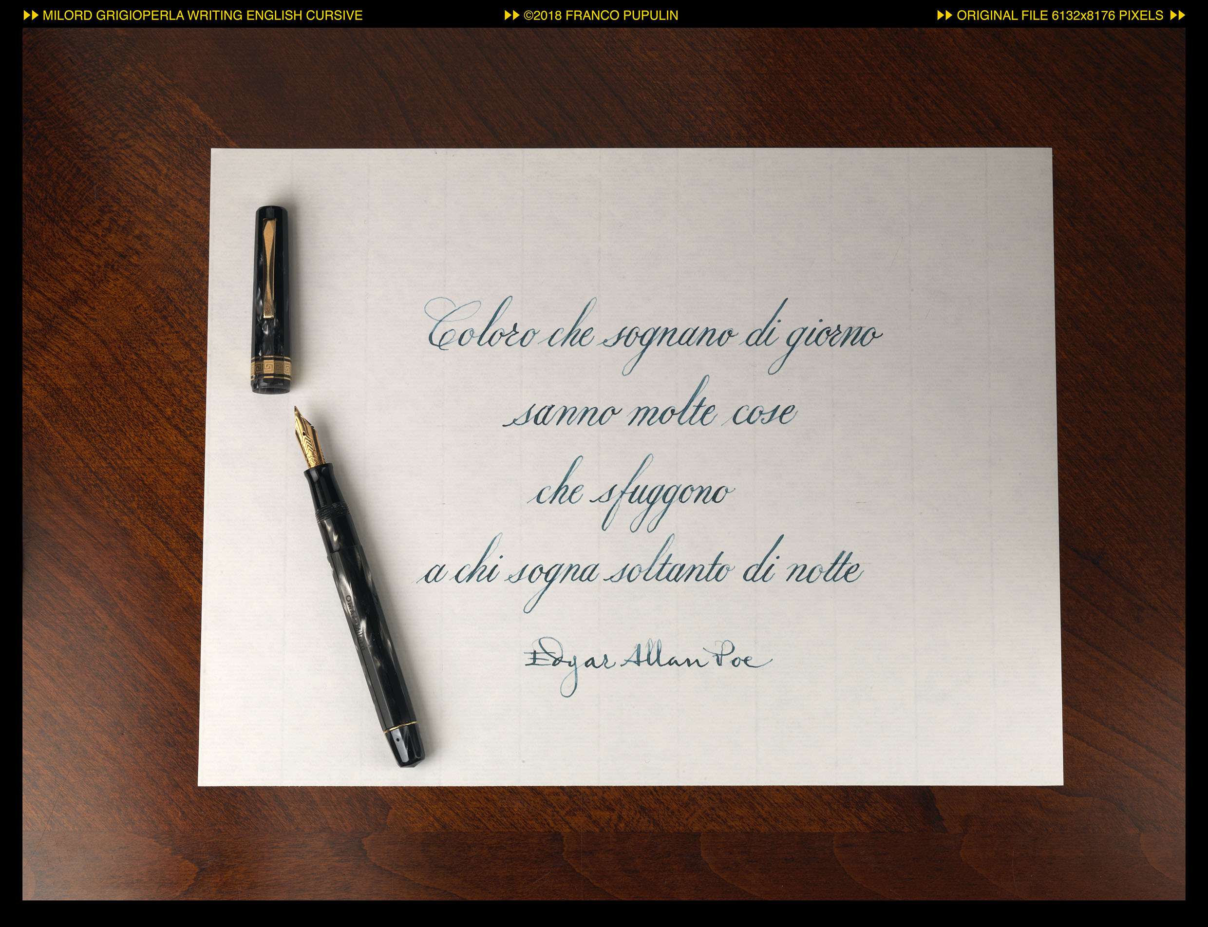 Durante i miei primi giorni come proprietario della Milord Grigioperla mi sono dedicato assiduamente a provare il suo pennino flessibile esercitandomi nella grafia corsiva inglese, tipo Copperplate e variazioni affini. In passato mi ero sporadicamente cimentato con questa grafia con poveri risultati. Ma ora, con un vero pennino flessibile, anche senza eccellere mi é parso che fosse più facile, quasi immediato, sentire il ductus corretto, quando fare una leggera pressione sui rebbi del pennino e quando rilasciare la tensione, in un movimento rotondo e quasi di danza del braccio e della mano. Sembra sciocco dirlo, ma il pennino corretto mi ha fatto da insegnante! Di fatto, grazie alla esperienza con il pennino flex della Milord, mi sembra di essere ora in grado di scrivere una decente grafia corsiva inglese anche con gli altri pennini fini ed extra-fini del mio arsenale, e persino con i pennini e stub.