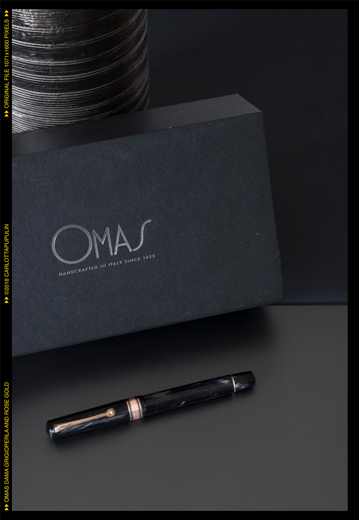 Mia figlia Carlotta è una appassionata di penne stilografiche grigie. Il suo colore preferito è il nero (e lo é sempre stato, da quando era una infante), ma la celluloide grigia scura, screziata, le risulta irresistibile. Per il suo ultimo compleanno e per la sua meritatissima ammissione a un Master in arpa barocca a L'Aia, le avevo regalato una Omas Dama in celluloide grigia perlata e finiture in oro rosato. È una penna elegantissima, assolutamente classica nella sua forma dodecagonale, con l’anello alla greca e la clip a ruzzolina, ma resa più contemporanea dagli accenti rosati dell’oro impiegato per le finiture, perfetta per una ragazza nei suoi vent’anni. Le fotografie istituzionali e pubblicitarie della penna la presentarono con finiture in un oro quasi rosso, ma nella realtà la doratura é di un colore splendido e dolce, appena rosé. Omas presentò questa bellissima creazione proprio poco prima di chiudere i battenti, credo nel 2015, in una edizione limitata di 131 sets, che comprendevano anche una penna biro nella stessa livrea. Io fortunatamente sono riuscito a trovare la sola penna, probabilmente un pezzo di prova della tiratura limitata, giacché non reca impresso né sul fusto né sul cappuccio alcun numero di limitazione.