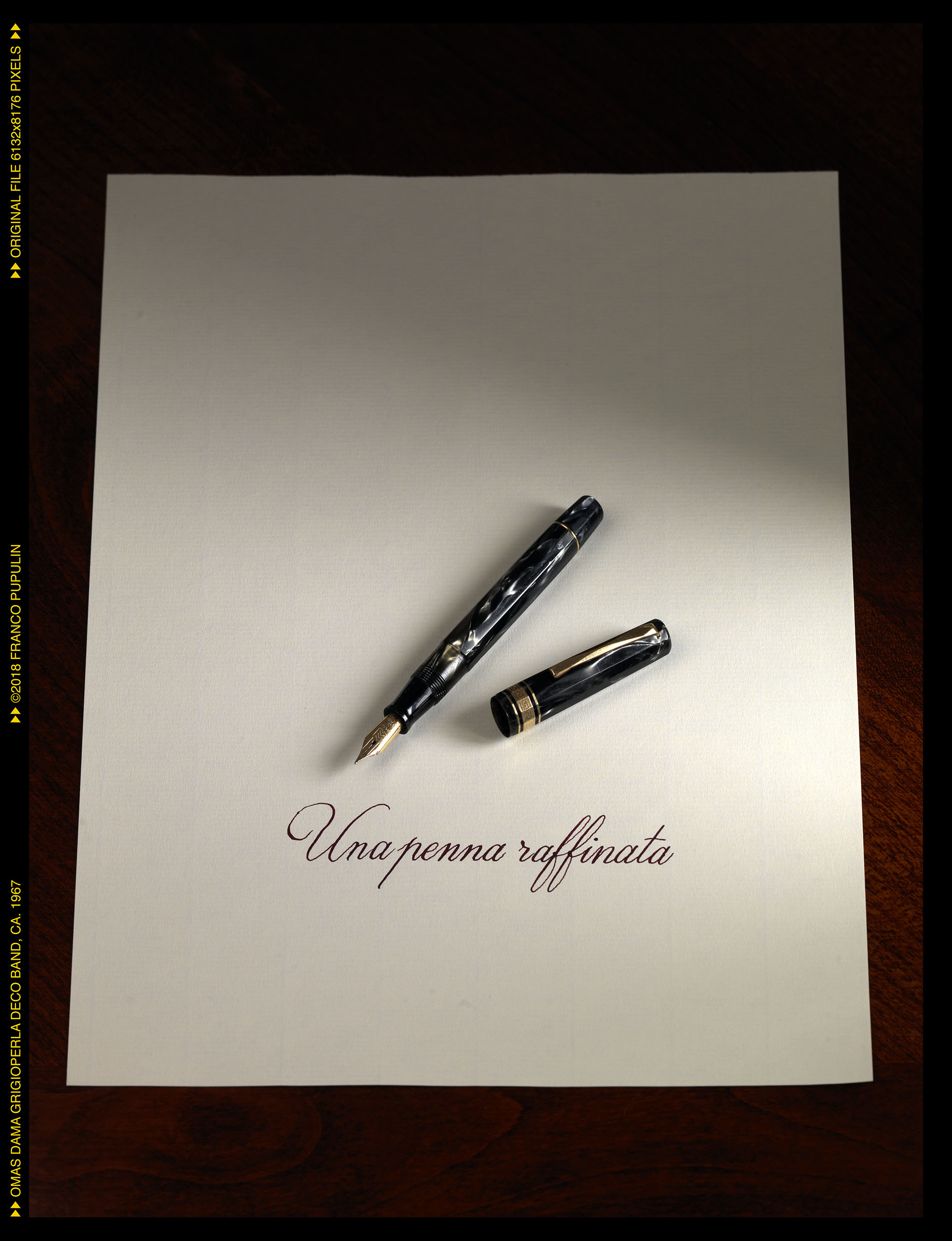 Ho già scritto su questo forum che le penne Omas con l’anello decorato “alla greca” rappresentano ai miei occhi la quintessenza di Omas, e mi ripeto dicendo che il motivo greco di Omas è forse il più bello è semplicemente “intricato” tra quelli che conosco. Ma c’è ancora un’altra ragione che rendeva la Dama Grigioperla Deco band quasi necessaria alla mia collezione. Faccio un passo di lato in questa storia.