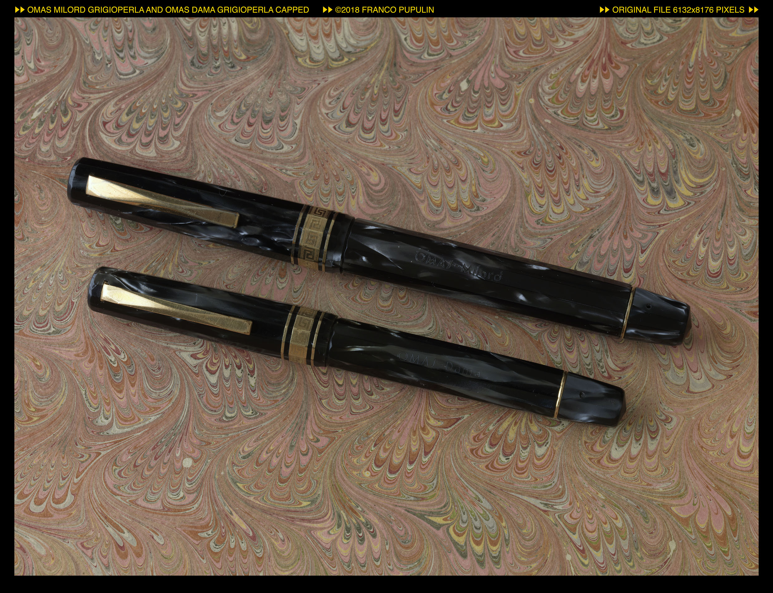 Poi, su una pagina locale di vendite in linea, scovai una penna fantastica. Una Omas Grigioperla Deco band, ma nella sua versione piccola, “per signora”, chiamata Dama: la legittima sorella minore della mia Milord, anch’essa targata circa 1967. Le foto di presentazione erano orribili, riprese con il telefono e il flash, cosicché l’unica cosa sicura era che si trattasse di una Dama Grigioperla, per via della celluloide e dell’anello con la greca, ma in quali condizioni era un vero mistero. Richiesi altre foto, arrivarono peggiori. Il prezzo della penna, considerando che era la sorellina della mia, continuava però a sembrarmi irresistibile... e non resistetti!