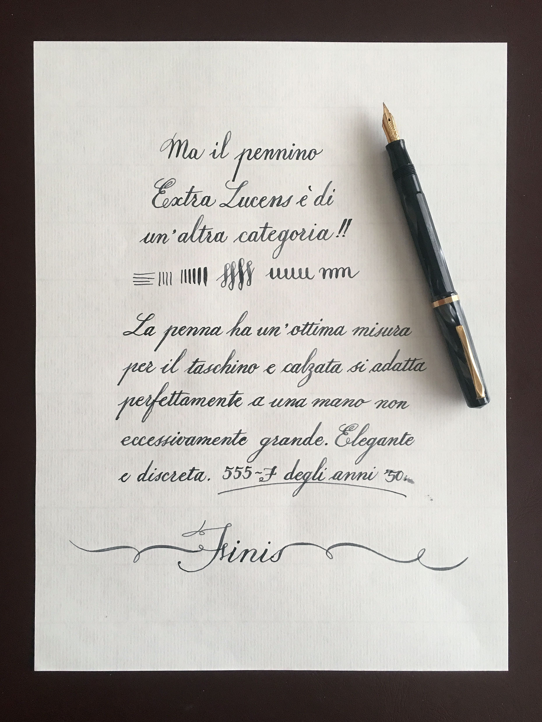 Certo, niente a che vedere con la docile flessibilità del pennino Extra Lucens della Omas, che é un vero piacere da usare. Il pennino Omas ha una punta fine, come quello della mia Milord. Di fatto, questo piccolo pennino mi ha insegnato che, quanto a flessibilità, “la misura non conta”: i due pennini Extra Lucens, anche se di taglia diversa, si comportano in modo pressoché identico sulla carta. Lezione appresa.
