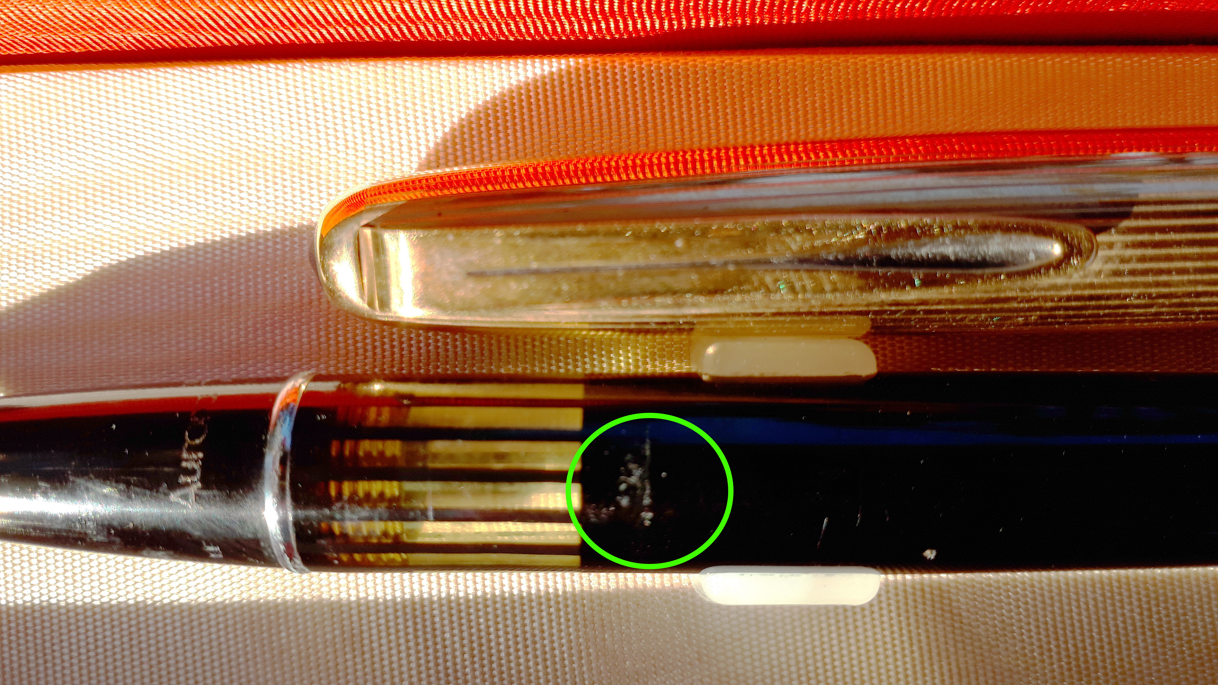 Presenta delle ossidazioni interne (naturali dopo 60 anni!) che complicano le cose, al punto tale da aver provocato dei graffi sulla penna (foto 5) e sbucciando un pò l'anello di blocco del cappuccio.