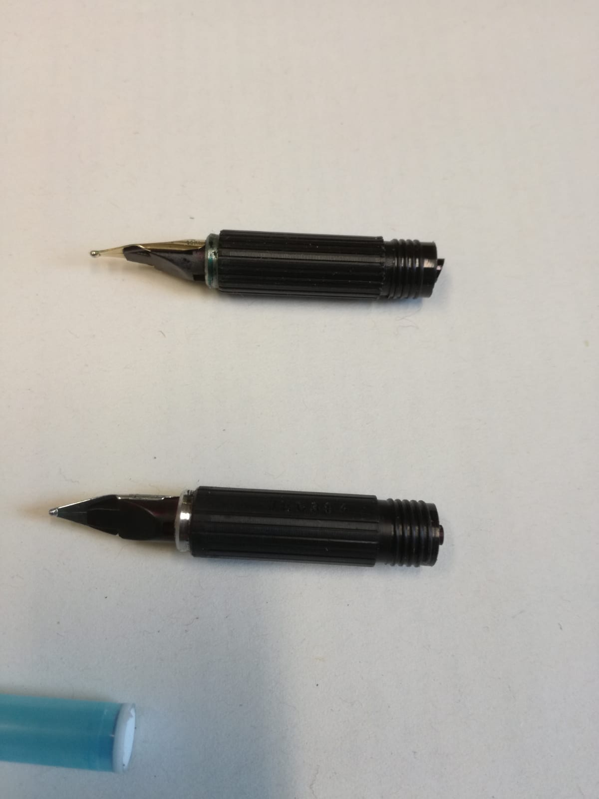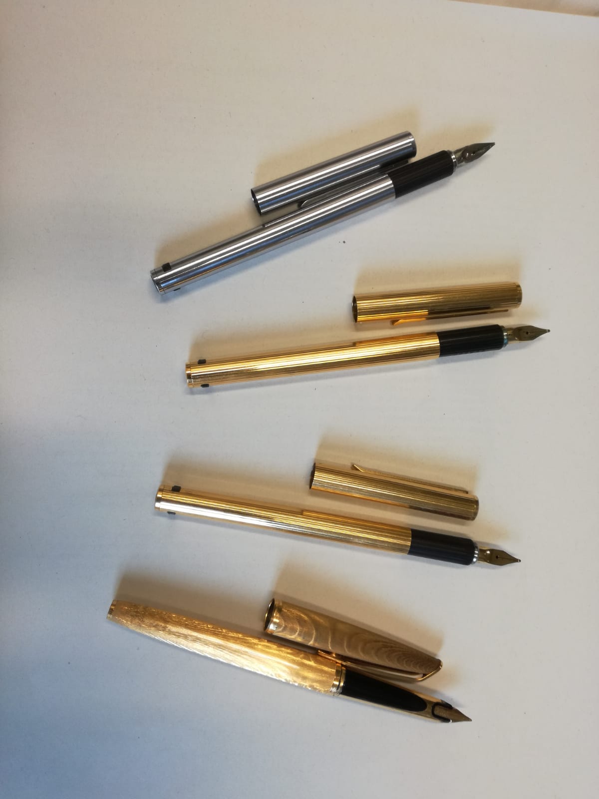 La prima penna è la Hastil Ecosteel con pennino in oro bianco. La mia ha la particolarità di usare cartucce internazionali tipo Pelikan e non Aurora o Parker, peraltro sul wiki troviamo menzione di questa produzione con alimentatore tipo Pelikan, in parte commissionata da Montblanc per una serie e a suo marchio. Ha quindi un innesto decisamente più piccolo e tagliato dritto. La seconda è la Hastil mandata a revisionare alla Aurora e la terza è la ritrovata sua gemella, la quarta penna, non c’è bisogno di dirlo, è la Waterman GF.