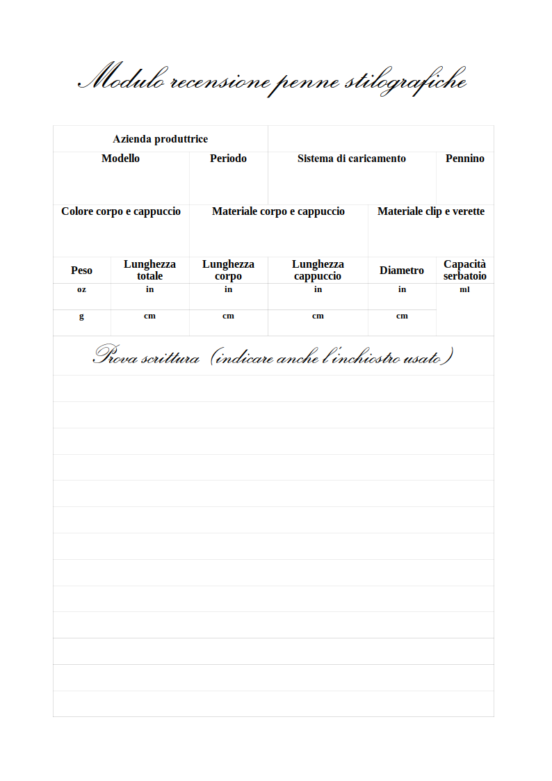 Complimenti Syrok, la scheda mi sembra utilissima anche perché standardizza la recensione e favorisce i paragoni fra le penne recensite.