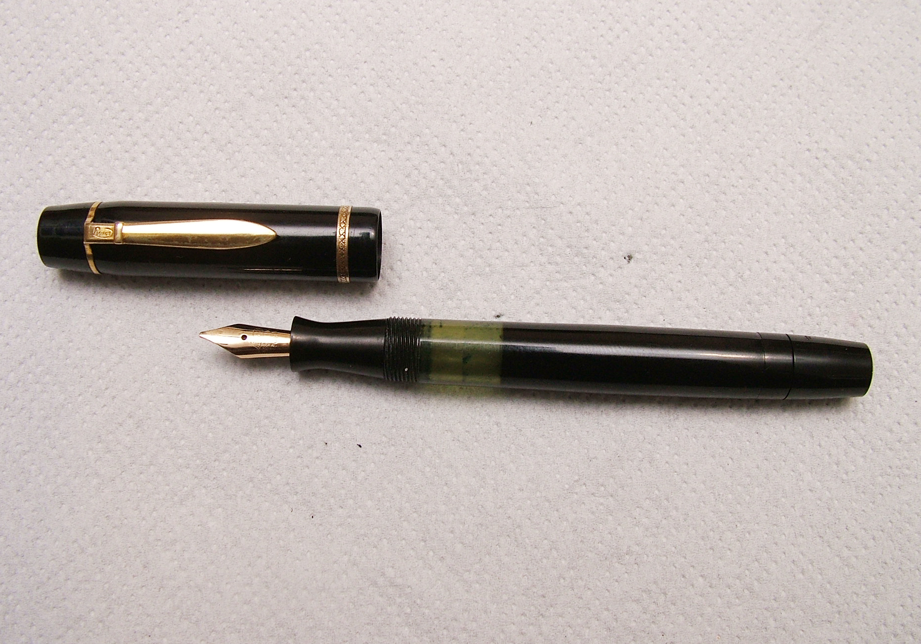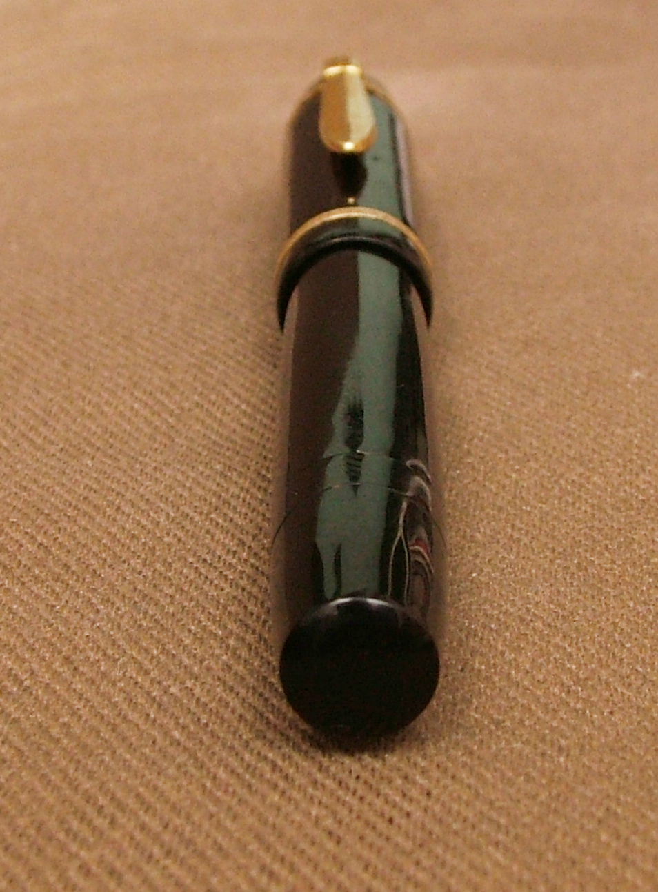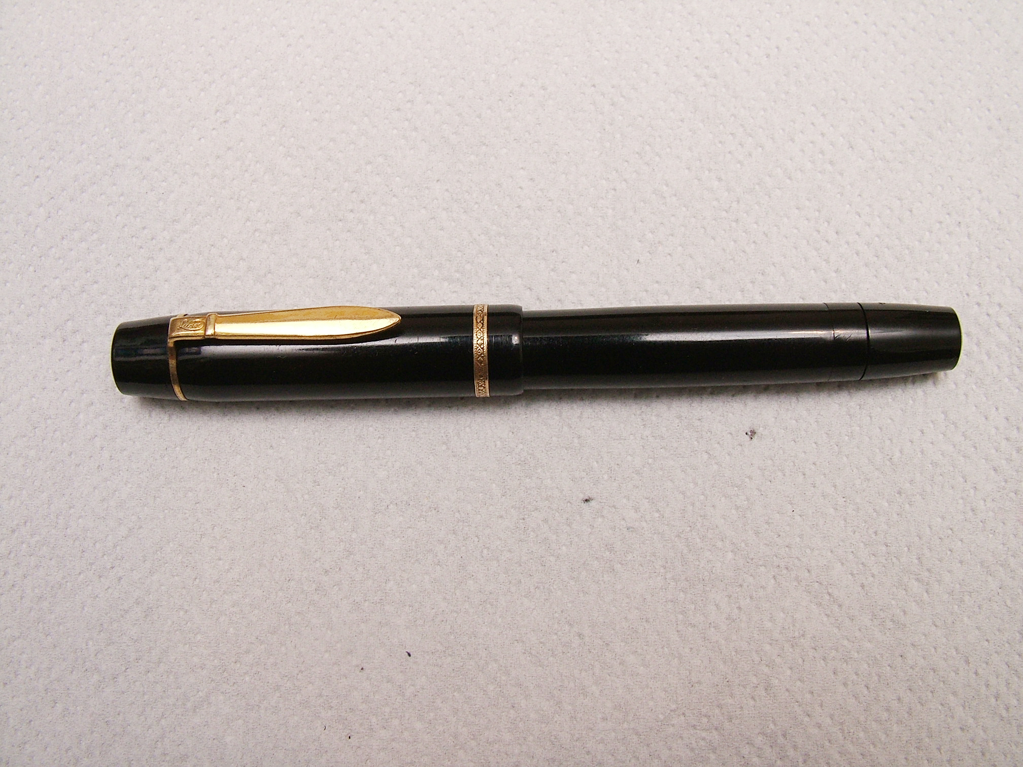 Vi presento una penna di chiaro stile teutonico molt sobria e robusta ma purtroppo sfortunata, con pistone bloccato nel suo alloggiamento , credo don sia il suo oppure la sede si è ristretta impedendone ogni movimento (nella sezione tecnica mostrerò la sua riparazione).Particolare la clip a spada con inciso sull' elsa Luxor e la vera sul cappuccio finemente lavorata.