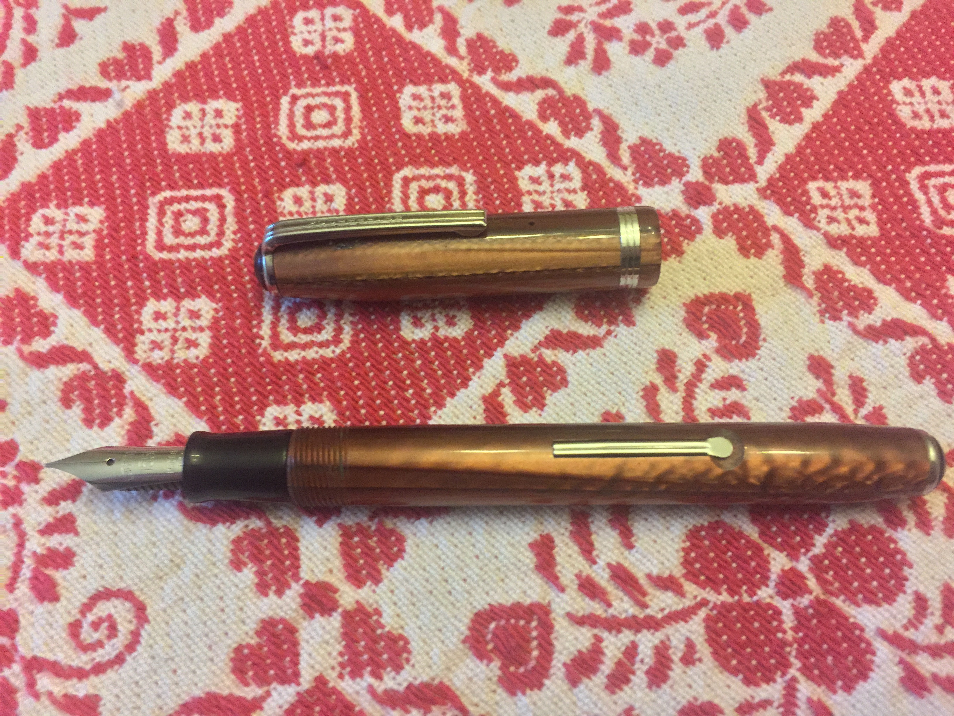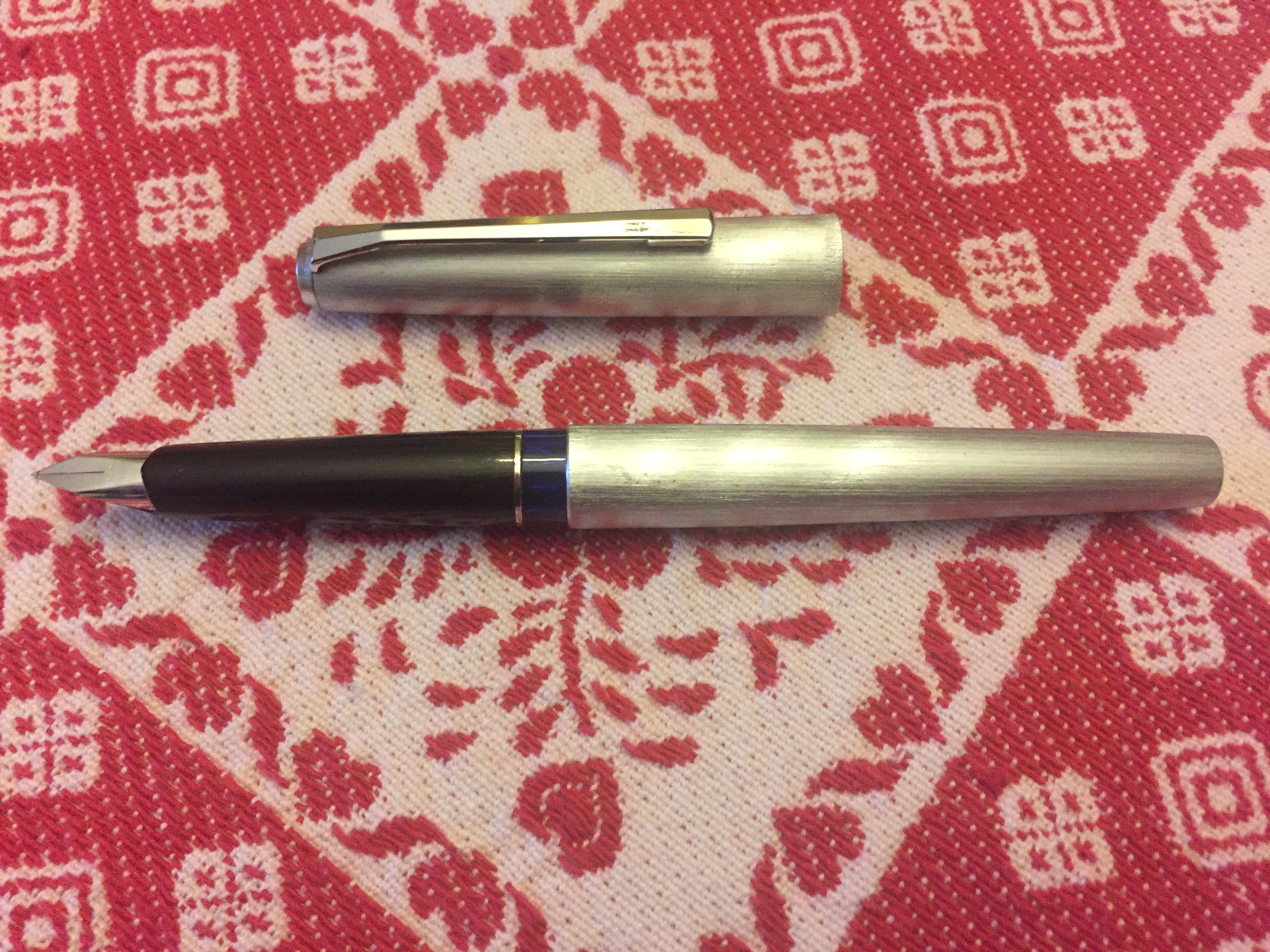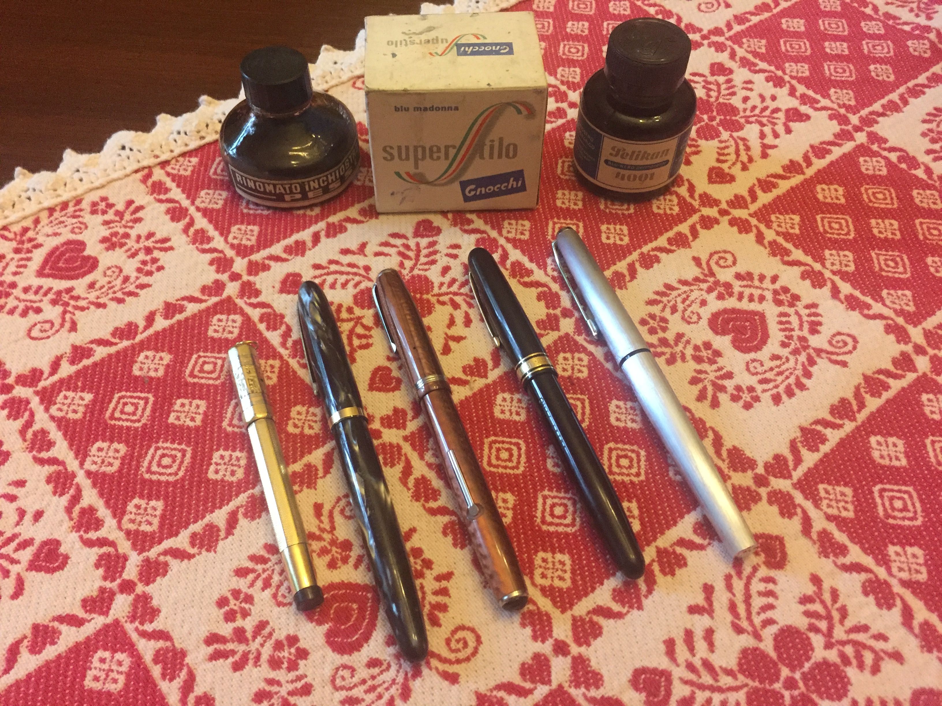 Ecco in carniere le prede dell'ultima fiera antiquaria/modernariato frequentata: tre boccette d'inchiostro vintage Pelikan 4001 blue, Superstilo Gnocchi blue e Pessi nero; rientrante misura lady anonima laminata Kosca, funzionante, in buone condizioni; Omas 556/S colore grey-mabled in ottime condizioni, forse usata pochissimo, funzionante, anni 60; Esterbrook J, pennino acciaio, carica a levetta con ancora il serbatoio inchiostro integro, ottime condizioni funzionante; Omas Extra (555/S), anni 80/90, non presenta il classico restringimento del materiale con cui è assemblata (resina vegetale), pennino oro 585, funzionante in buone condizioni; per finire una Pelikan Silvexa, brushed steel anni 70, pennino acciaio in ottime condizioni, carica cartuccia/converter, funzionante. Allego foto.