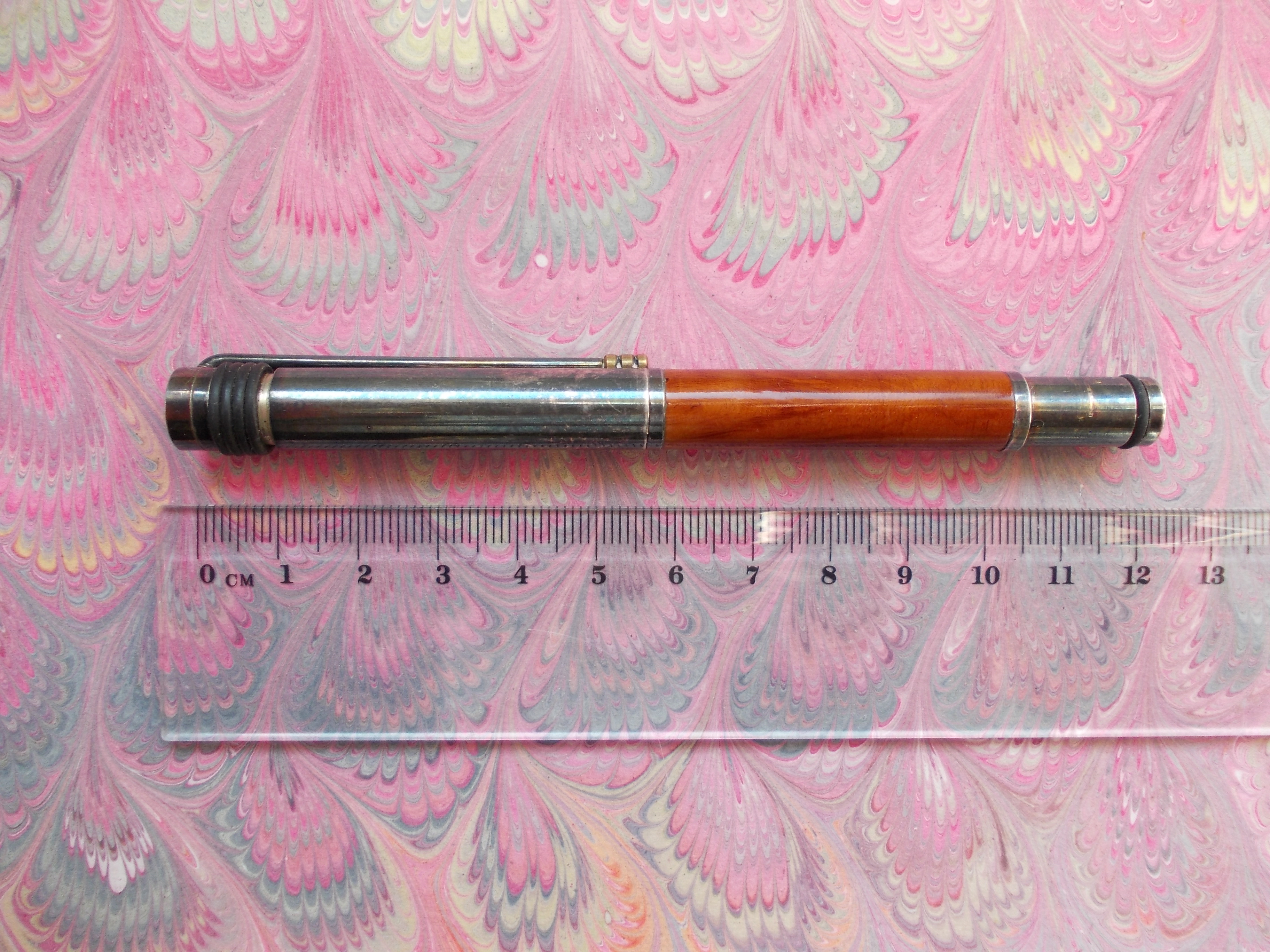 La prima cosa che ho notato è il puntale che sembra quello della Pilot Capless. La penna è di argento o forse laminata d'argento: il colore dominante è (per ora) quello grigiastro del solfuro di argento, ormai comune nella nostra atmofera inquinata. C'è una parte centrale di resina che imita il legno.