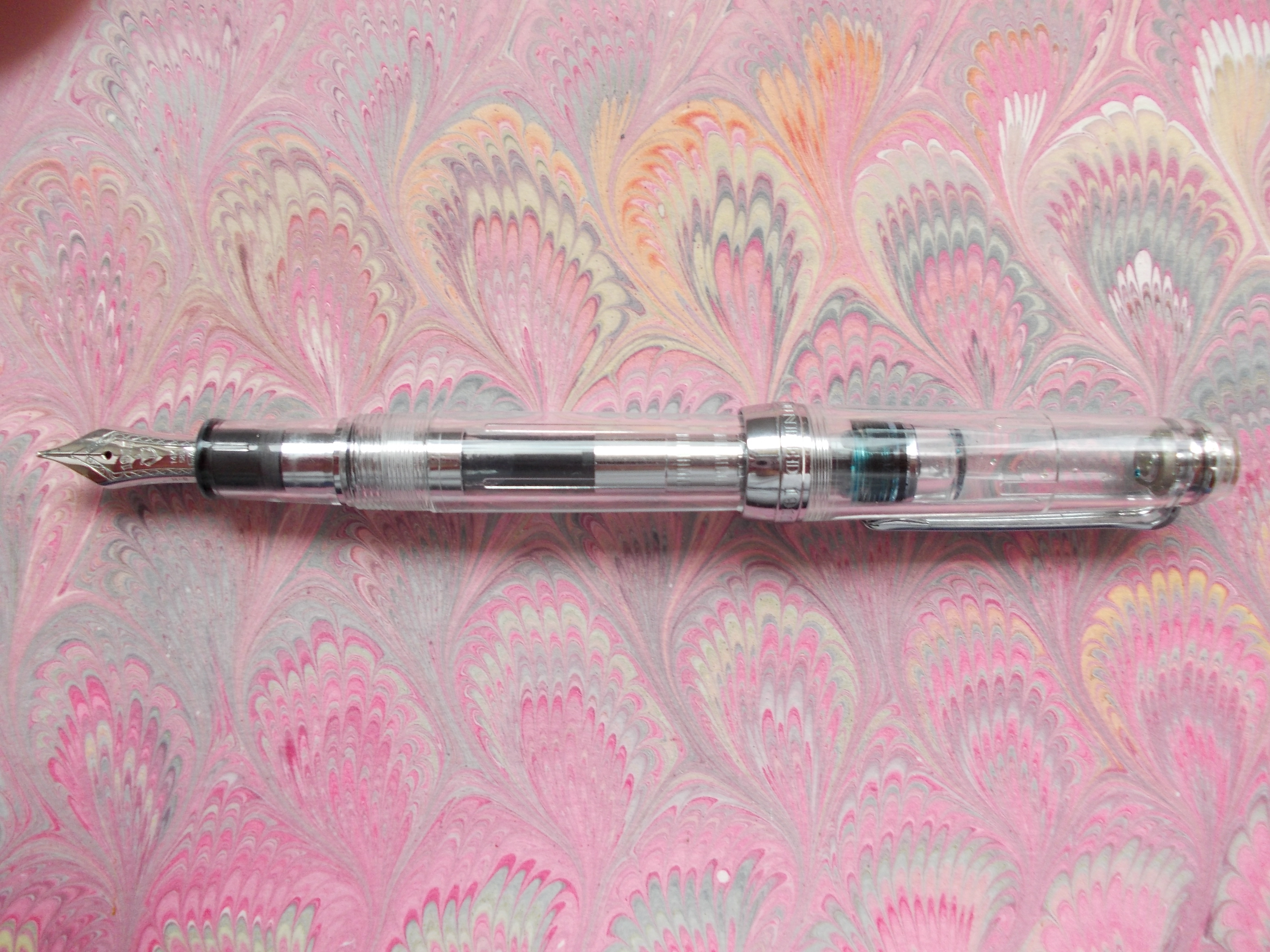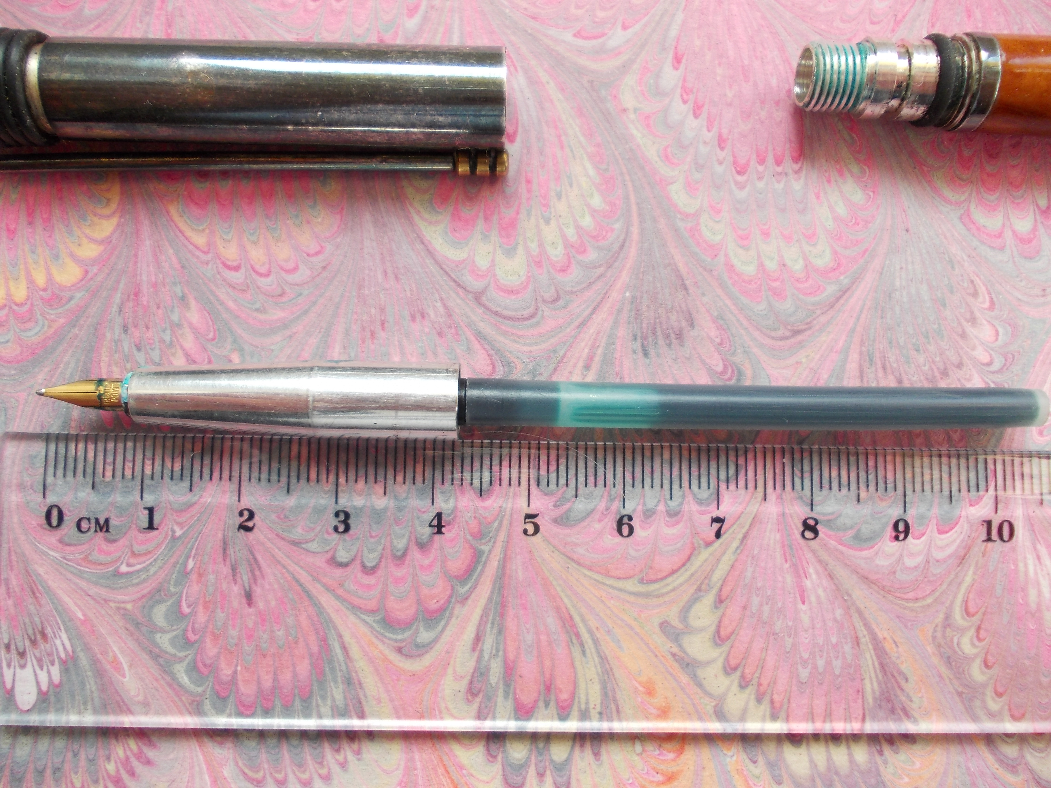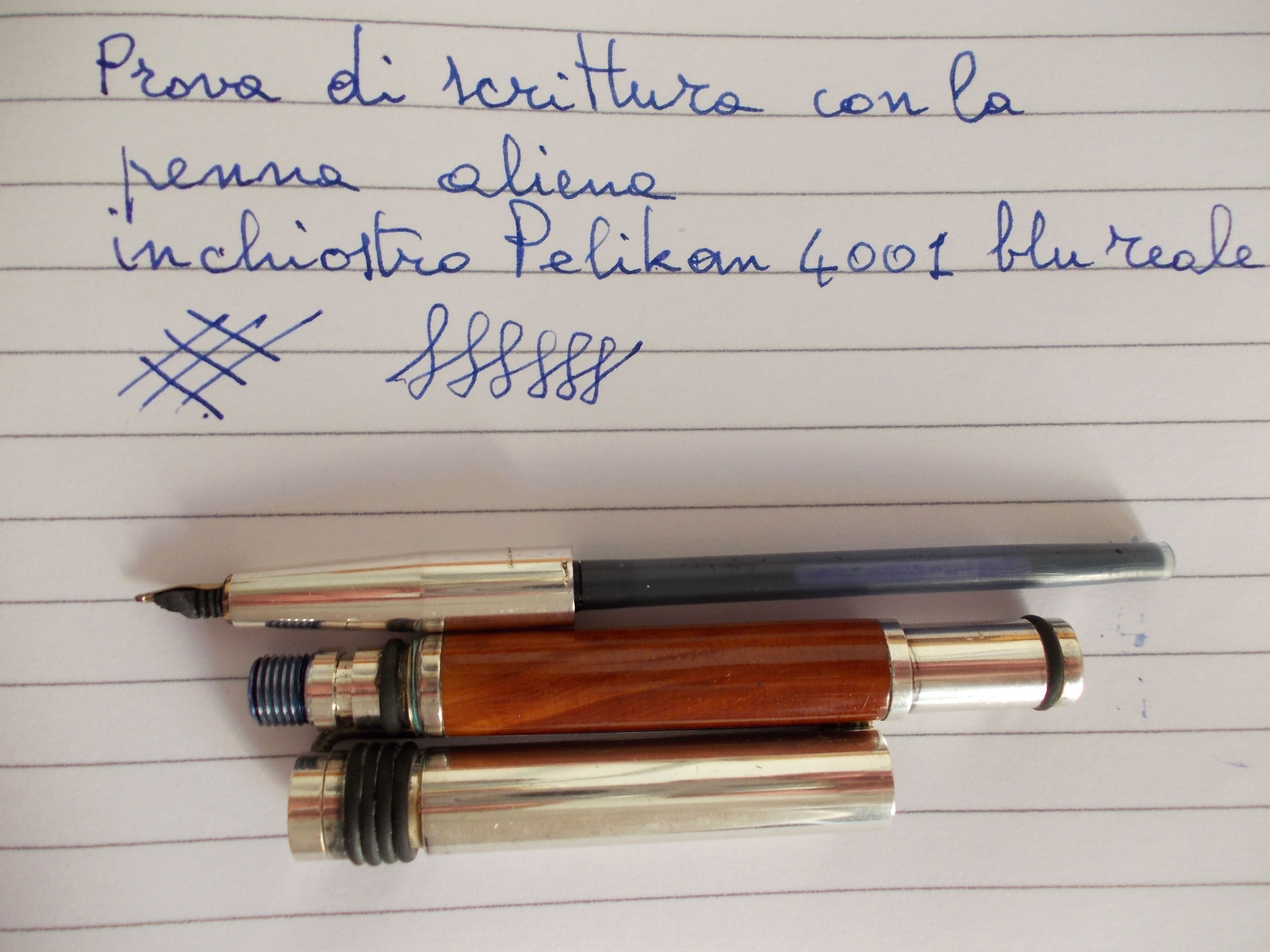 Restaurata la penna aliena. Dopo averla ripulita (è d'argento) ho provato a scrivere con la cartuccia originale extra slim. Non è stato possibile, benchè fosse ancora piena d'inchiostro, lo stesso terribile inchiostro verde che aveva allagato la Progear, molto persistente (soprattutto sulle dita). Non trovando una cartuccia o un converter che si potesse adattare, ho deciso di vuotare la cartuccia originale, dopo aver lavato bene il puntale. Nel togliere la cartuccia ho trovato una microscopica scritta "Sailor": è comunque una cartuccia diversa dalle comuni Sailor, forse fatta apposta per le stilografiche più strane. Ricaricata la cartuccia con inchiostro Pelikan 4001 royal blue la penna ha cominciato a scrivere bene, con un buon tratto medio-fine. Mah ... dopo sette o otto righe l'inchiostro comincia a mancare. Devo togliere o almeno allentare la mini-cartuccia e la penna riparte normalmente. Penso che l'aria non penetri bene al posto dell'inchiostro, tappandone l'uscita. Non ho pensato di smontare il puntale, per paura di fare una strage. Forse è solo questione di rodaggio.