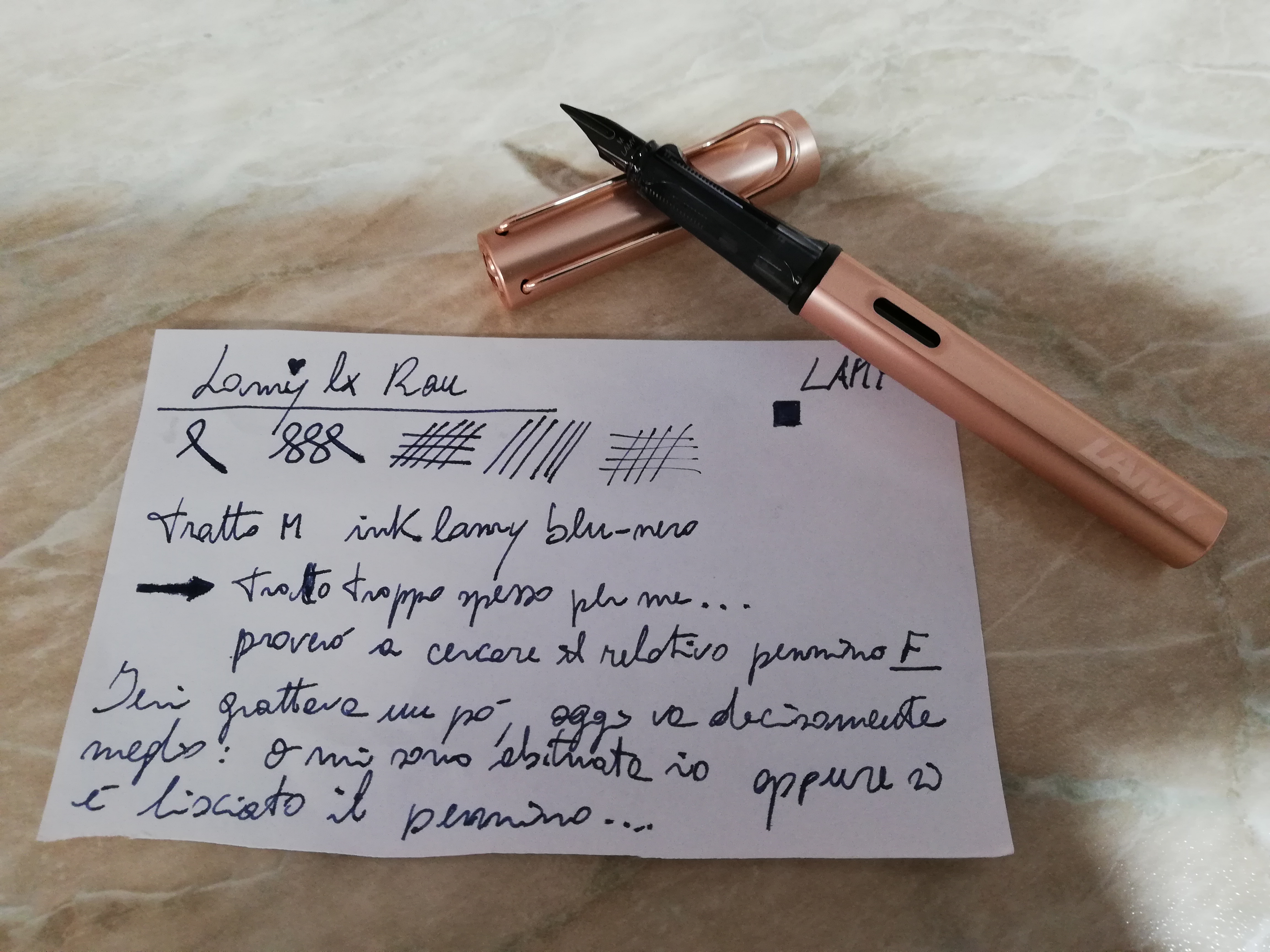 Tuttavia ho trovato forse il pennino M un po' abbondante oramai per me (ma l'avevano solo così)... Vedrò di provare qualche LAMY F per vedere se mi aggrada di più e se è il caso di cambiarlo (visto che esiste la possibilità)... Oppure provare un altro tipo di inchiostro...