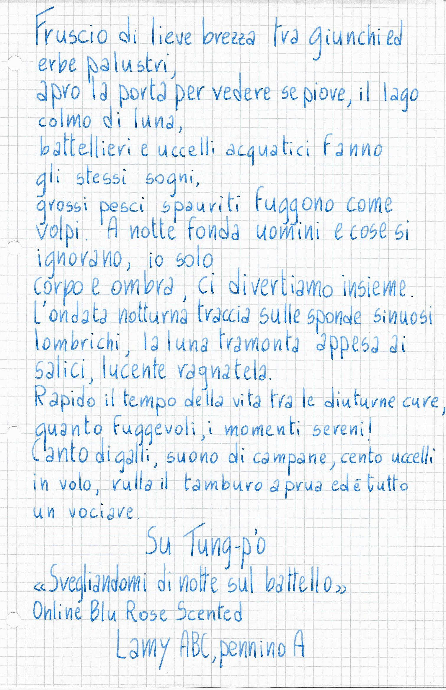 Effettivamente passa dal Royal blue mentre si sta scrivendo a un blu sbiadito dopo una mezzoretta, perciò non ha proprio un tono entusiasmante, preferisco il Blue Lamy decisamente.
