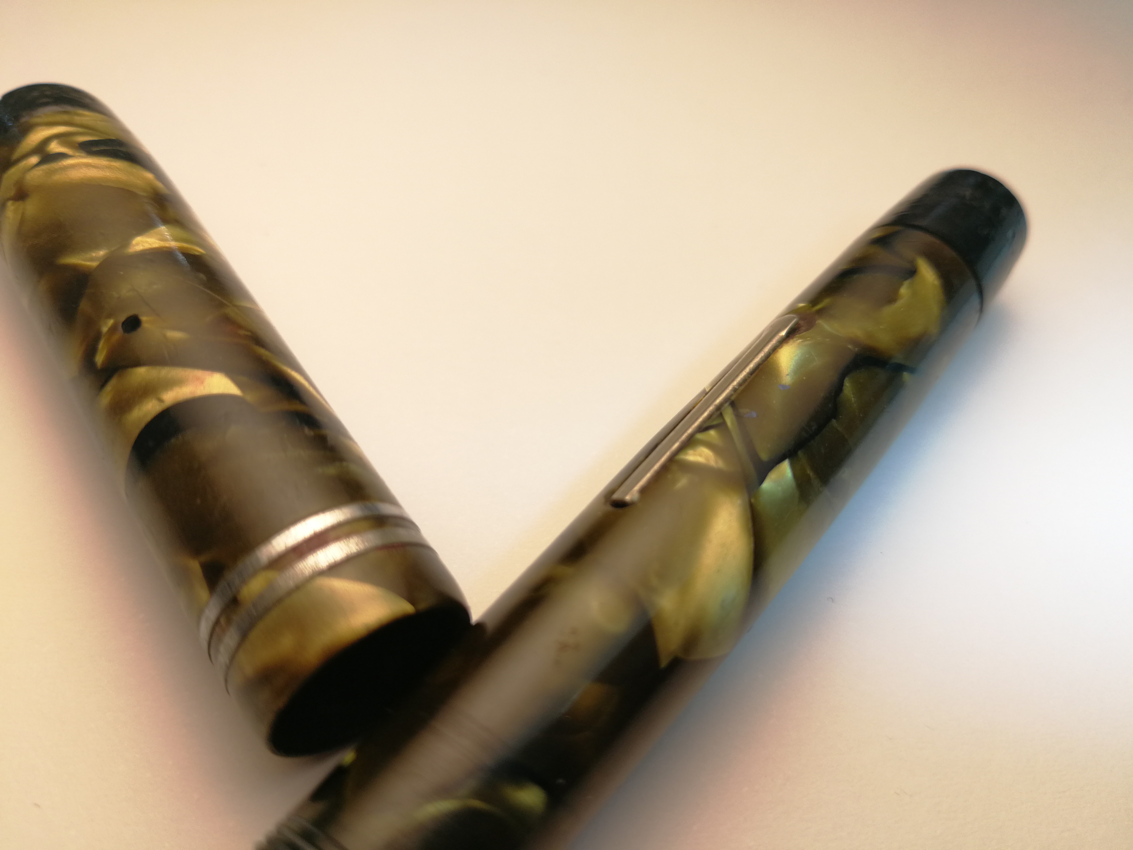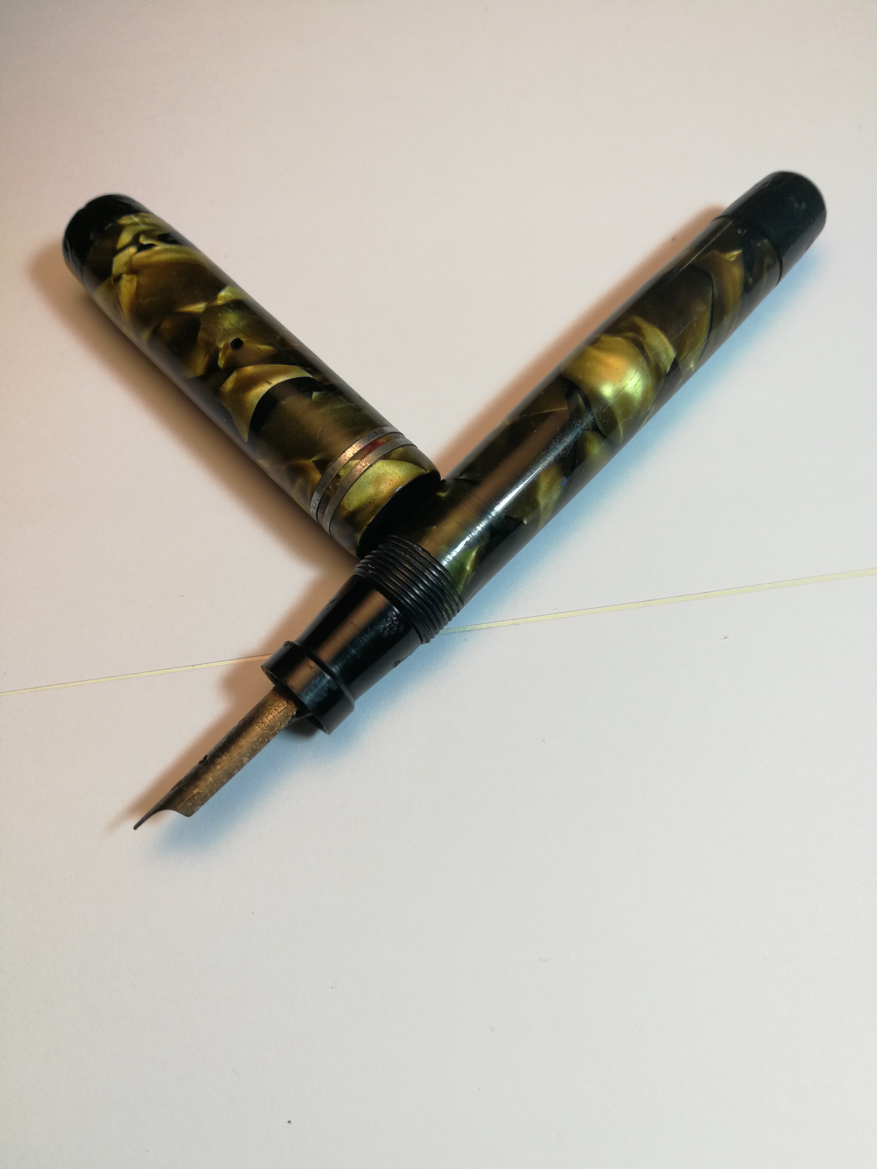 Oggi compro questa Stilo anonima ma con una celluloide veramente bella, anche se mi sa che il tappo non ha la clip considerati i due fori uno opposto all'altro. Però sul pennino vedo inciso un 60, poi un PRES e sotto un MIL.... Provenienza assolutamente sconosciuta