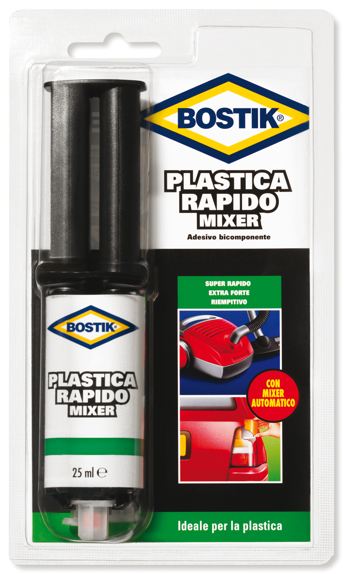 Ce ne sono di diverse marche, tipo la Bostik in figura. Io ne ho una confezione comprata in ferramenta da mia figlia per oggettini in pasta FIMO, in comodo un dispenser, come quello raffigurato, che eroga la giusta quantità per ognuno dei due componenti, purtroppo non ricordo la marca. Ne erogo una piccola quantità in un piattino di plastica poi con una palettina di plastica mischio i due componenti e la applico. Lascio asciugare per 24 ore.