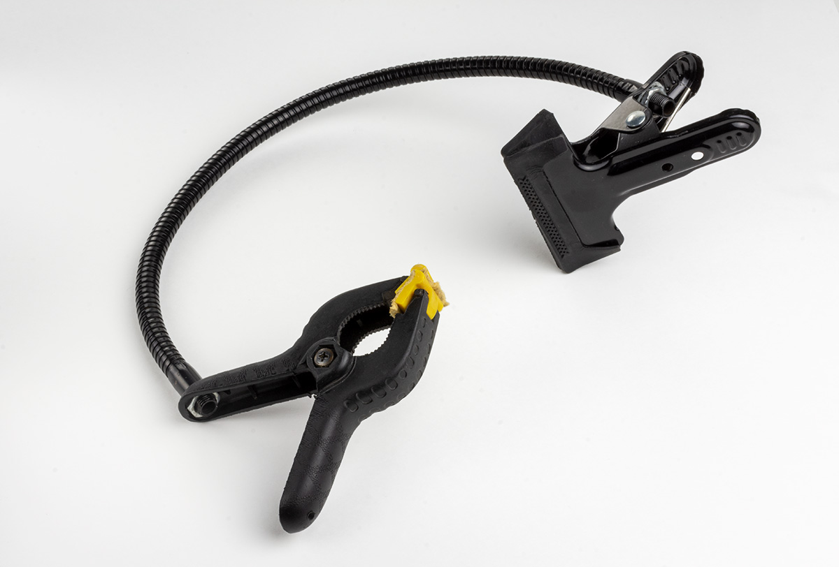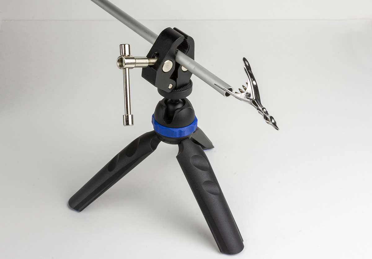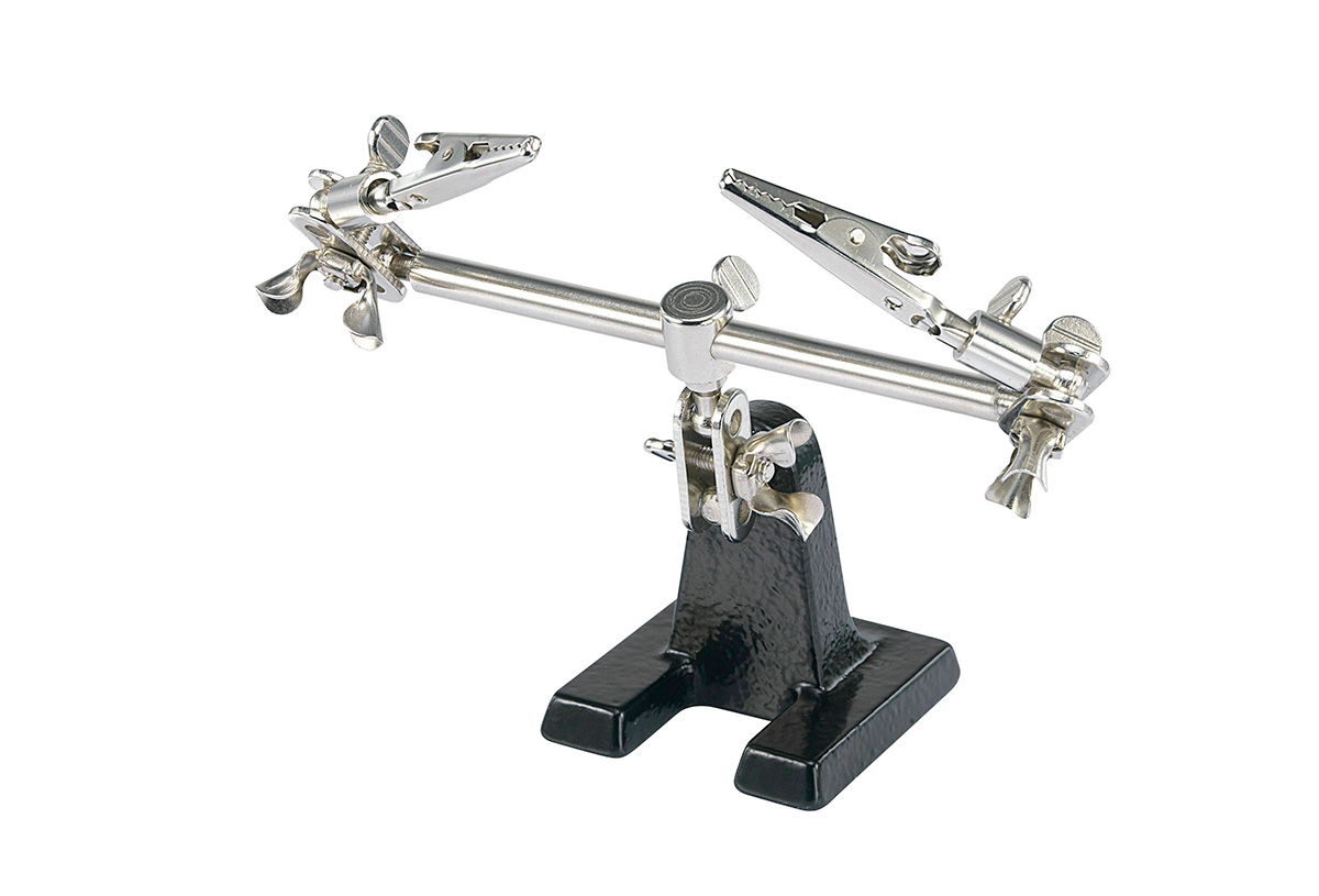Questo attrezzo, economico e facilmente reperibile su amazon, tramite un foro filettato si fissa su uno stativo, permette, con la sue ganasce, di fissare piccoli oggetti o tubi;