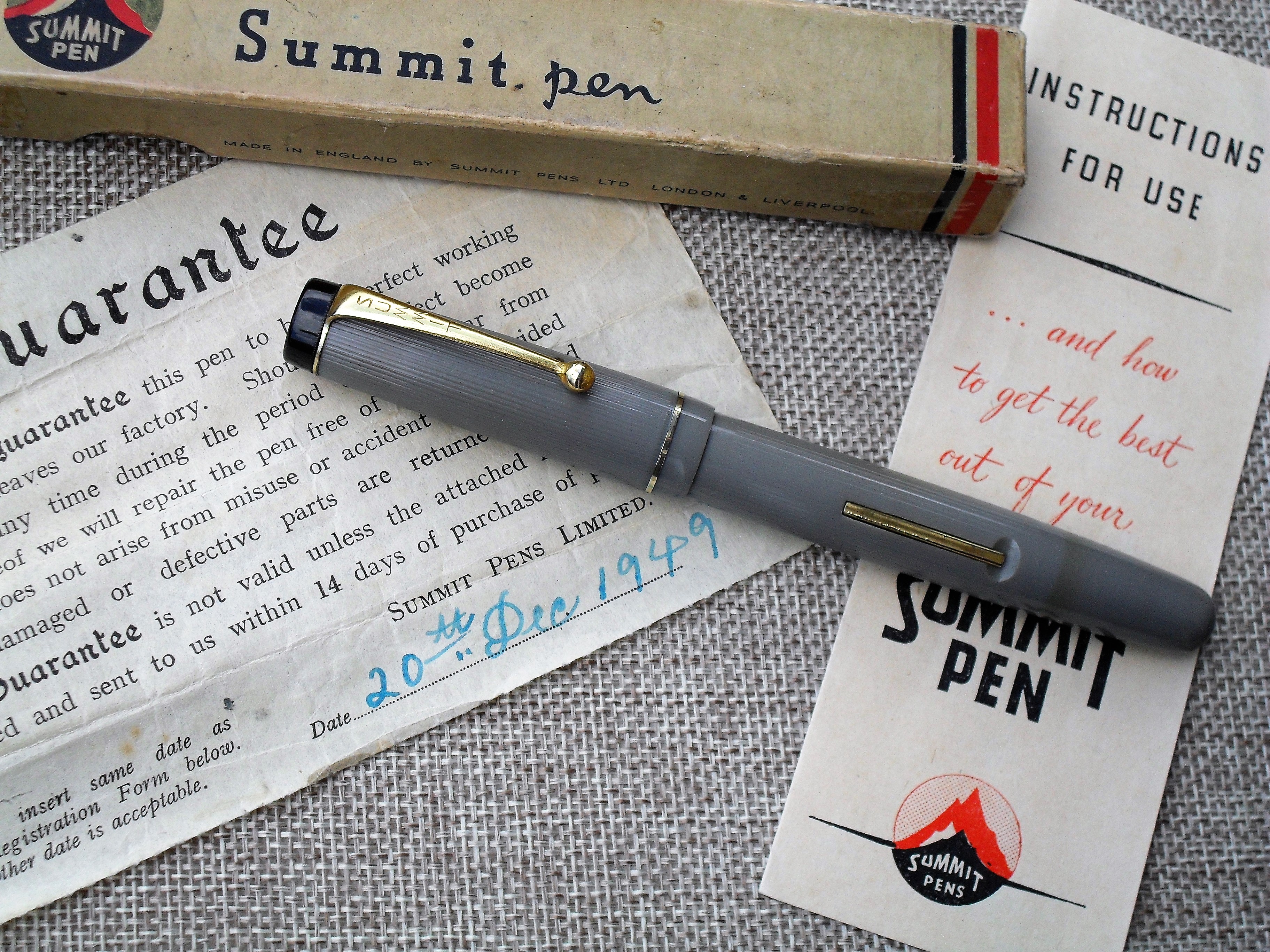 Il cappuccio si chiude in quasi due giri ed è dotato di due fori d’aereazione. Offerta dalla nuova società “Summit Pens Ltd.”, che nel gruppo di Liverpool aveva preso il posto di Curzons Ltd, questa stilografica era garantita per un anno da ogni difetto di fabbricazione e manteneva l’architettura generale delle stilografiche degli anni Trenta, con il pratico, semplice e robusto sistema d’alimentazione a leva.