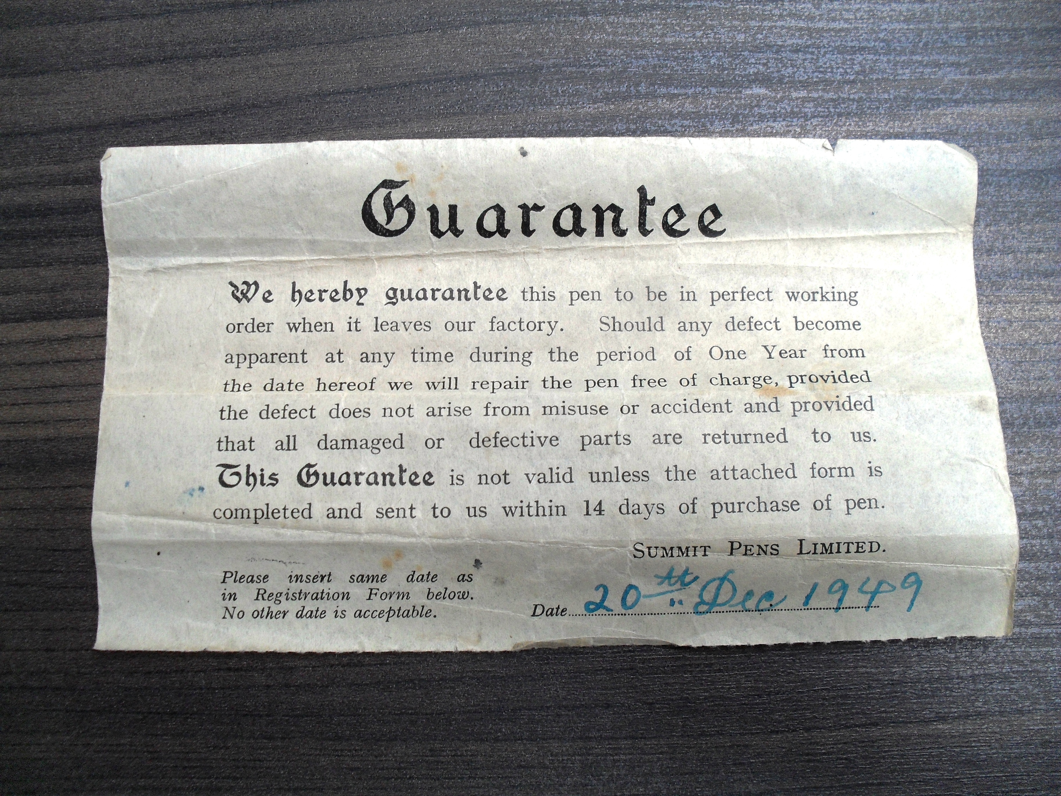 Ma già nel 1945 ci fu nuovo fermento e mentre al pubblico venivano offerti ancora i modelli anteguerra, qualche volta con qualche piccolo aggiornamento, a partire dal 1947 cominciarono ad affiorare stilografiche nuove. Fra queste la Summit S. 125 mk 2 che vi presento oggi, della quale, cosa abbastanza rara, possiamo azzardare la data d’acquisto, grazie alla garanzia: 20 Dicembre 1949; forse, ed è una circostanza che mi piace immaginare, si trattò di un regalo per Natale ed abbiamo anche la fortuna di sapere come scrivevano il suo acquirente oppure il destinatario del regalo…
