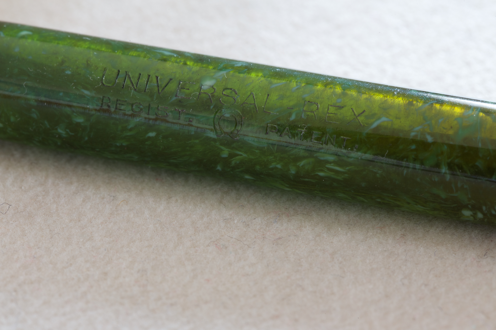 Non avevo mai avuto alcuna penna di questa marca, ho letto un po' di informazioni sul Wiki. La presenza del ferro di cavallo nell' iscrizione sul fusto dovrebbe fare risalire lo stiloforo agli anni 30/40. Carica a bottone di fondo, pennino in oro molto flessibile, una trasparenza ancora molto evidente.