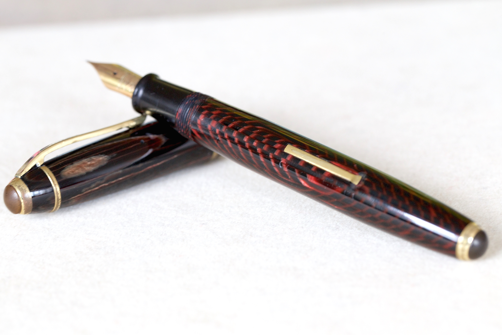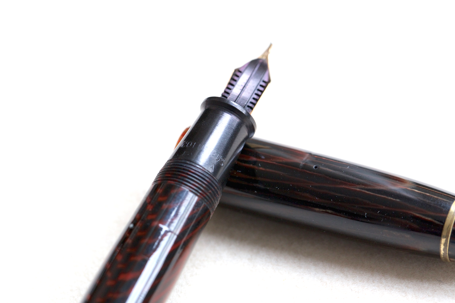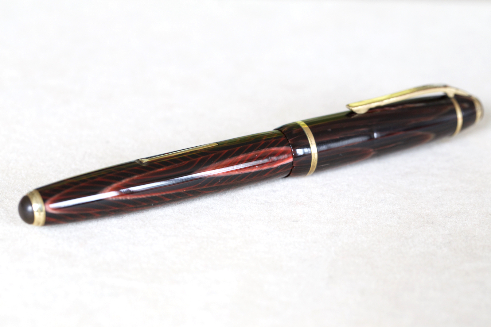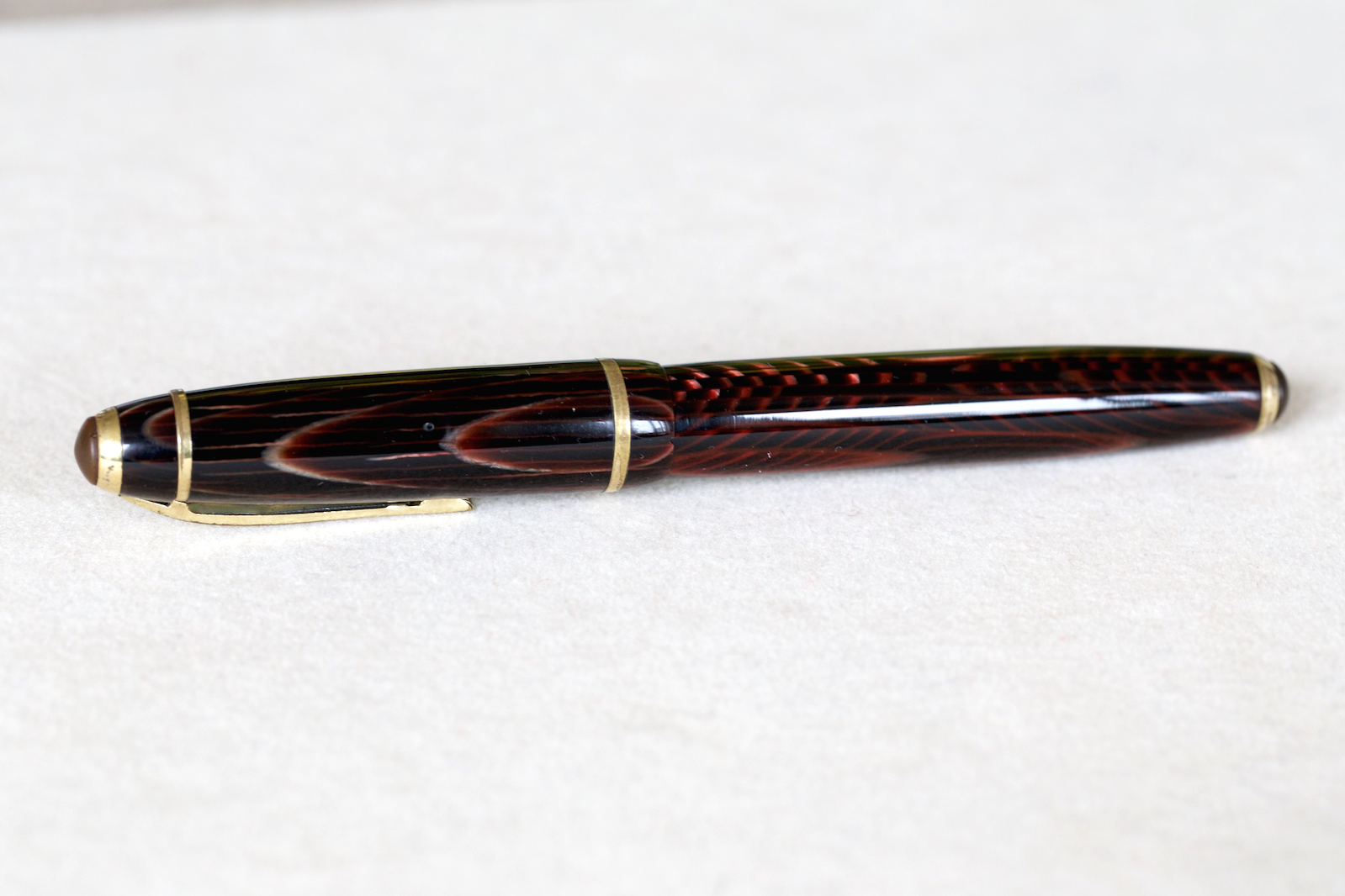 Buongiorno, ho preso questa Columbus 134 per la sua bellissima celluloide, il fusto ha striature rosse che alla luce diventano brillanti regalando disegni veramente belli. La penna monta un bel pennino medio Columbus 154 mediamente flessibile. È una penna dalle dimensioni ragguardevoli, si fa sicuramente notare e si impugna bene. La definirei un altro capolavoro della maestria italiana degli anni quaranta!