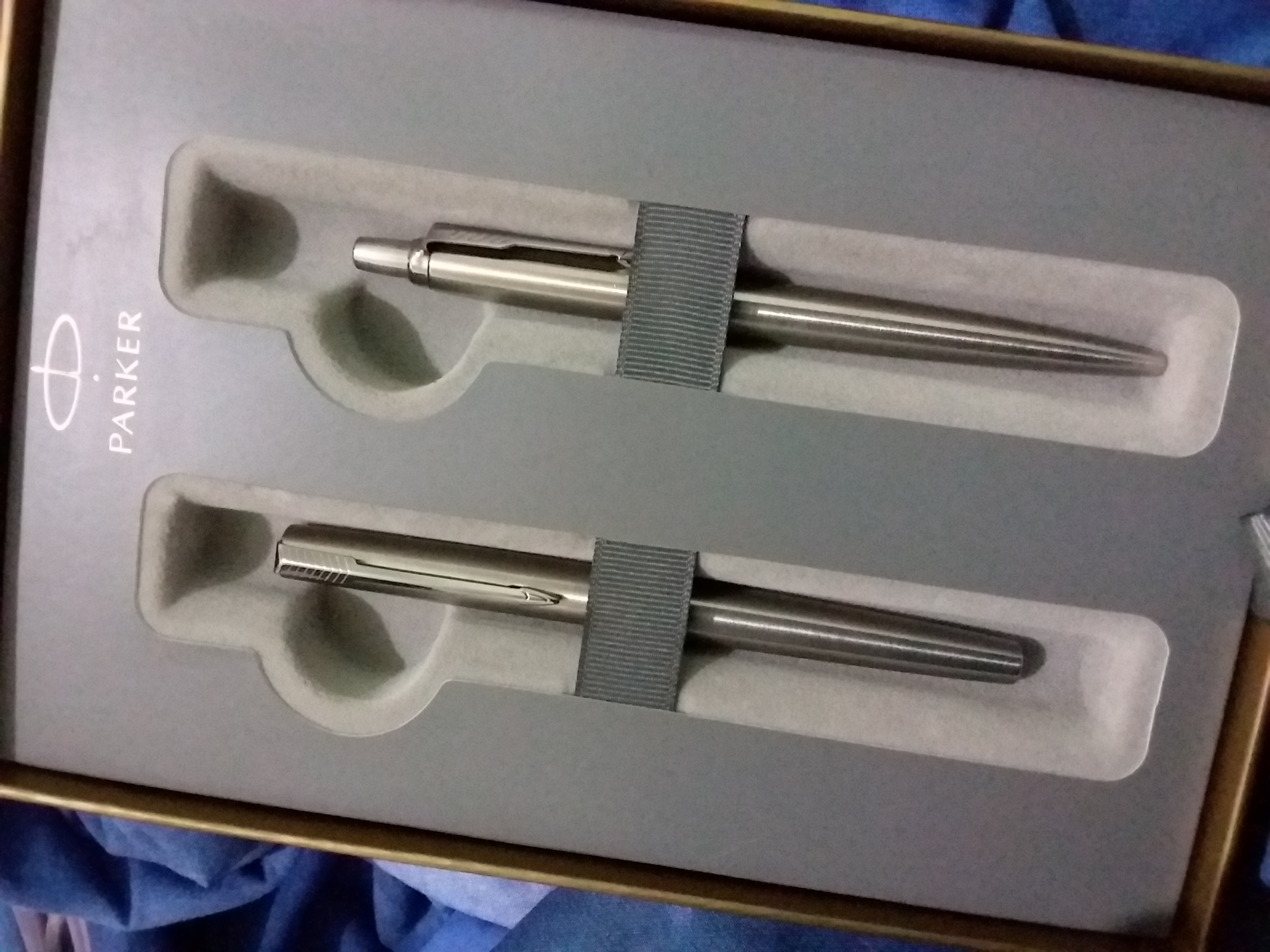 La stilografica mi pare una Parker 15 flighter con una penna a sfera in parure (che poi, effettivamente, pare identica ad una jotter con la parte anteriore in metallo anziché in plastica)