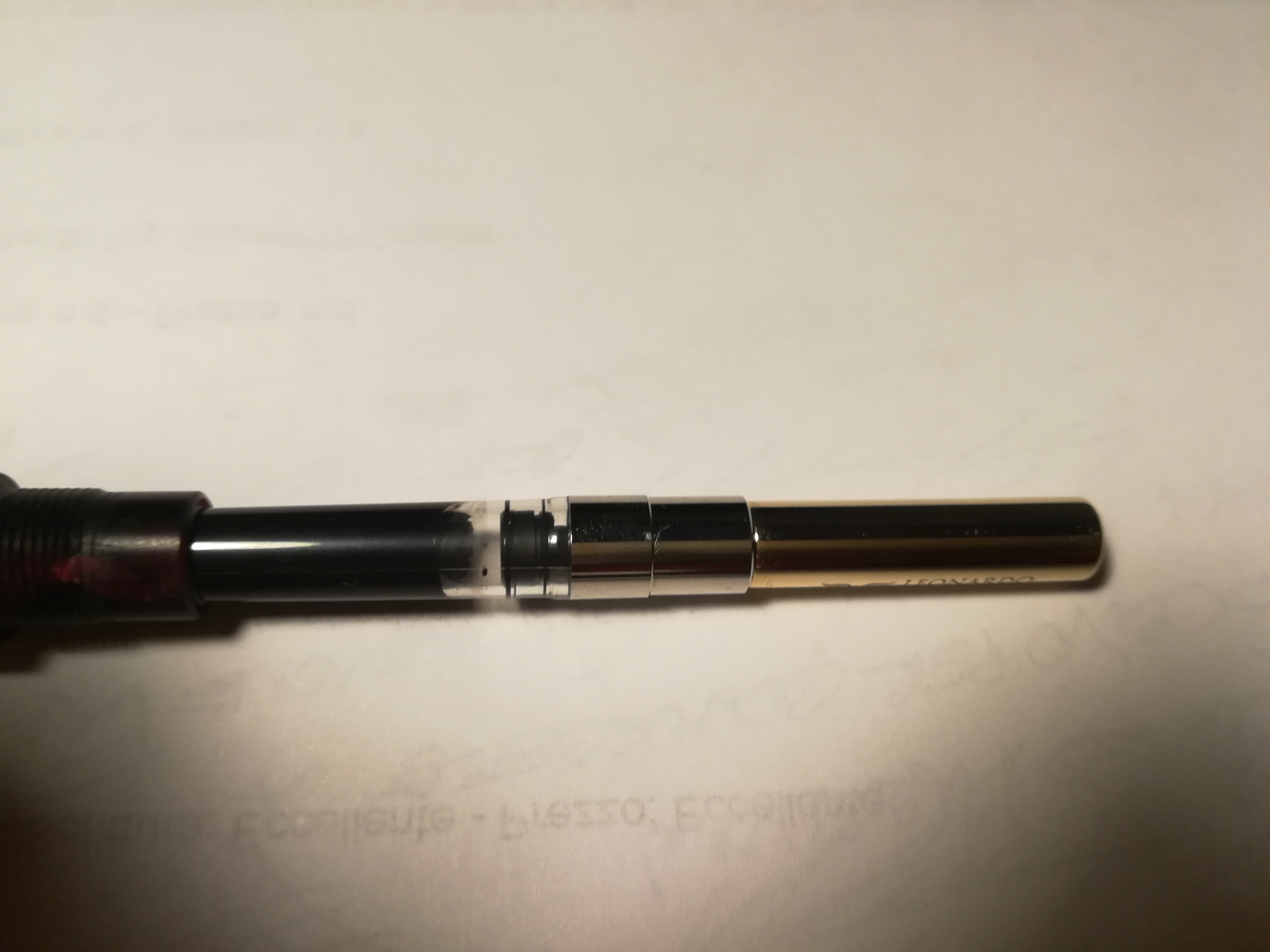 premessa: ho acquistato una Officine Leonardo Momento Zero Resin il cui pennino EF mi fa davvero dannare. sul forum ho letto che qualcuno ha risolto utilizzando il converter al posto della cartuccia. vi chiedo gentilmente dopo aver caricato l'inchiostro il pistoncino deve rimanere alto o devo portarlo a fine corsa? vi posto due foto di come è ora.