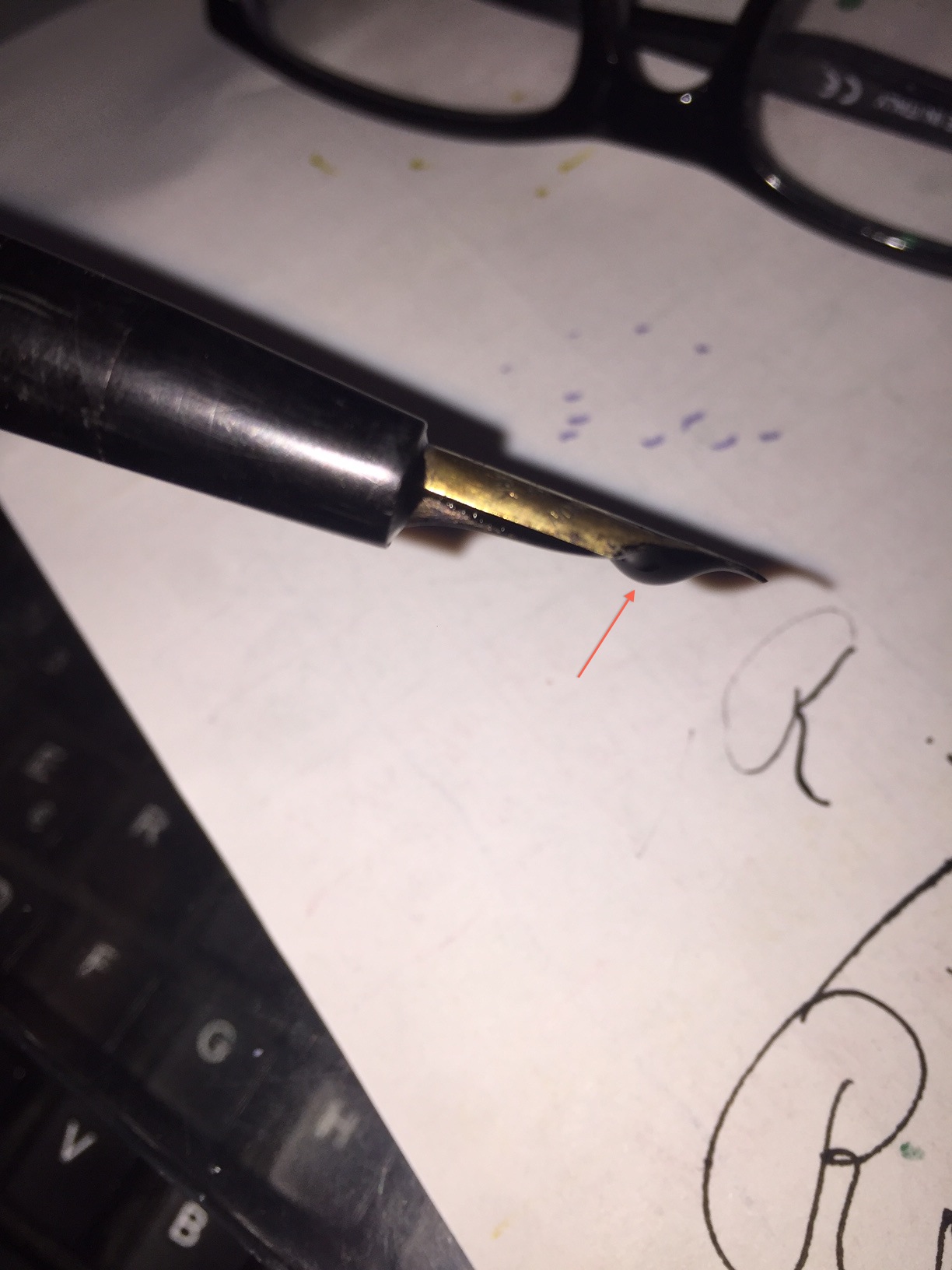 vi posto una foto della mia penna non bene identificata, che dopo una ripulitina e un refill mi ha dato questo problema, una gocciolona di inchiostro che fuoriescedalla parte inferiore del pennino.