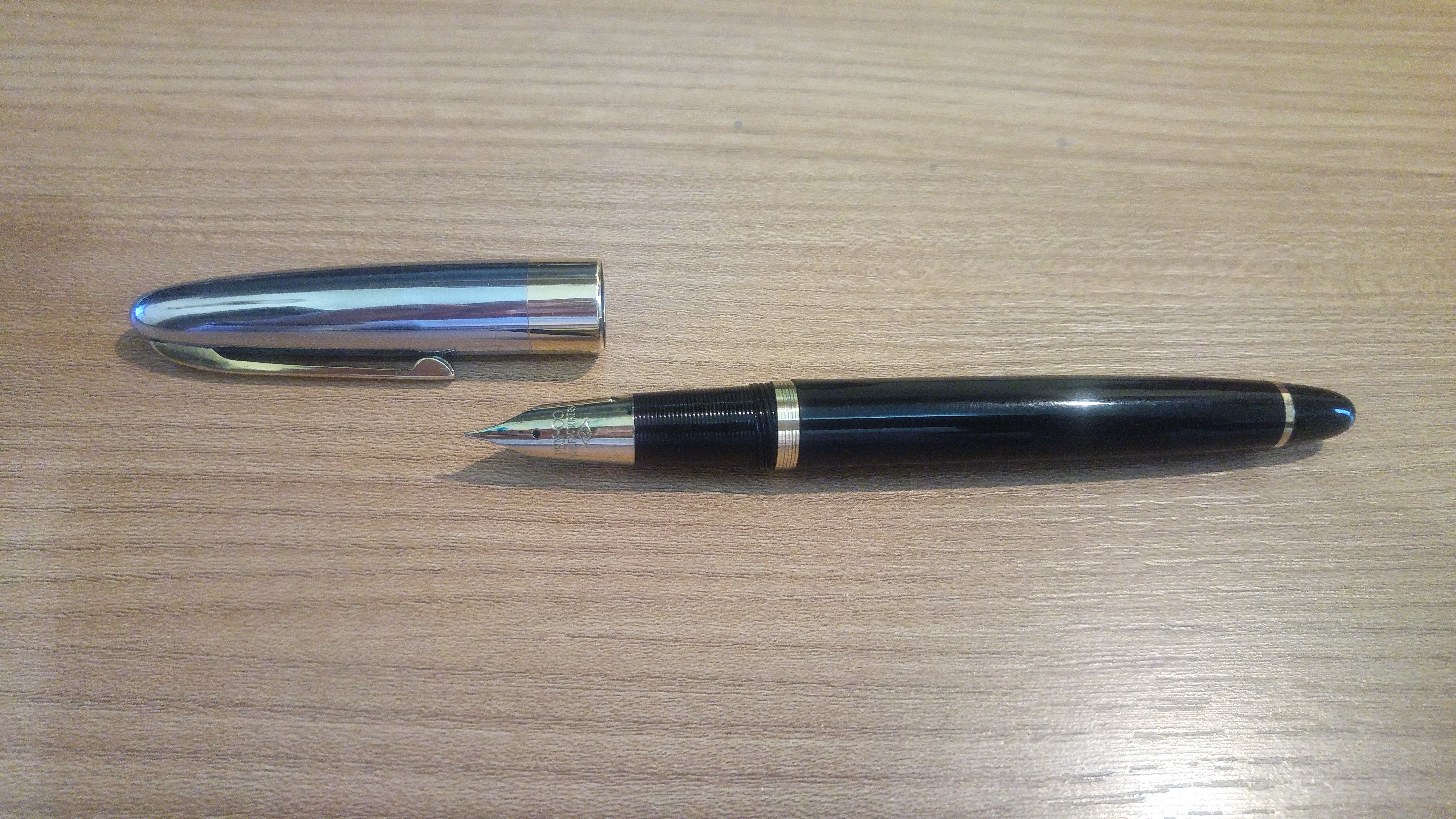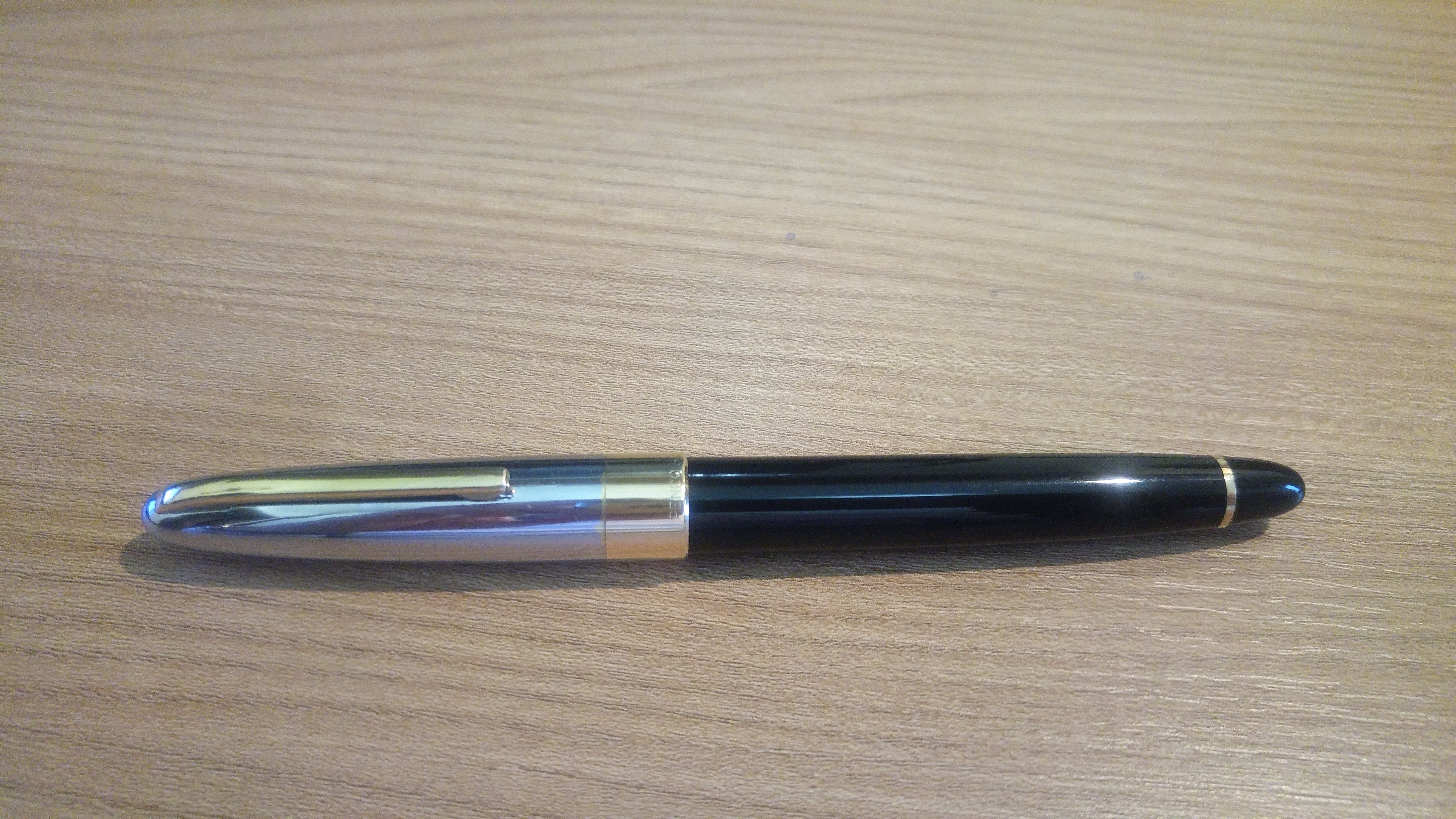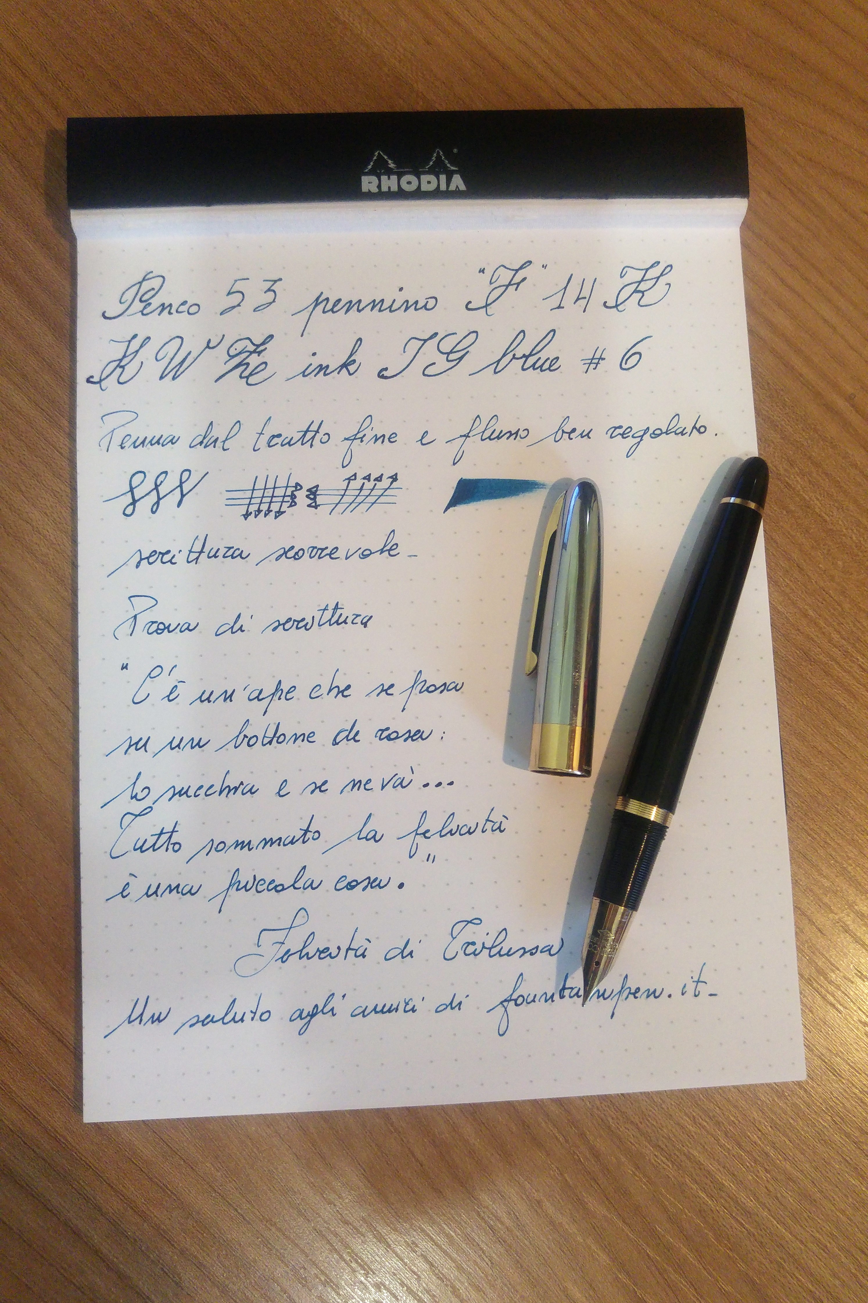Il mio esemplare è l’ultima serie a pistone ed ha il cappuccio cromato con la banda dorata in basso. La penna è comodissima, con il cappuccio che si rimuove con mezzo giro, si calza comodamente, ben bilanciata sia con che senza cappuccio. Il pennino è duro, ma scorrevole con un bel tratto fino e flusso generoso. Appena tornato a casa le ho dato una lavata, una bella lucidata per togliergli la patina del tempo, che le si era accumulata addosso, ed è tornata subito in carreggiata, a riprove della buona qualità con cui venivano realizzate le 53. Purtroppo ha perso un po' di cromatura sul cappuccio, ma credo che visto i 63 anni di età minimo che ha ci può stare. Non sono un intenditore di vintage, ma sono rimasto molto colpito dalla 53 che mi sta facendo compagnia da diversi giorni caricata con un bel KWZ IG Blue #6. Eccola