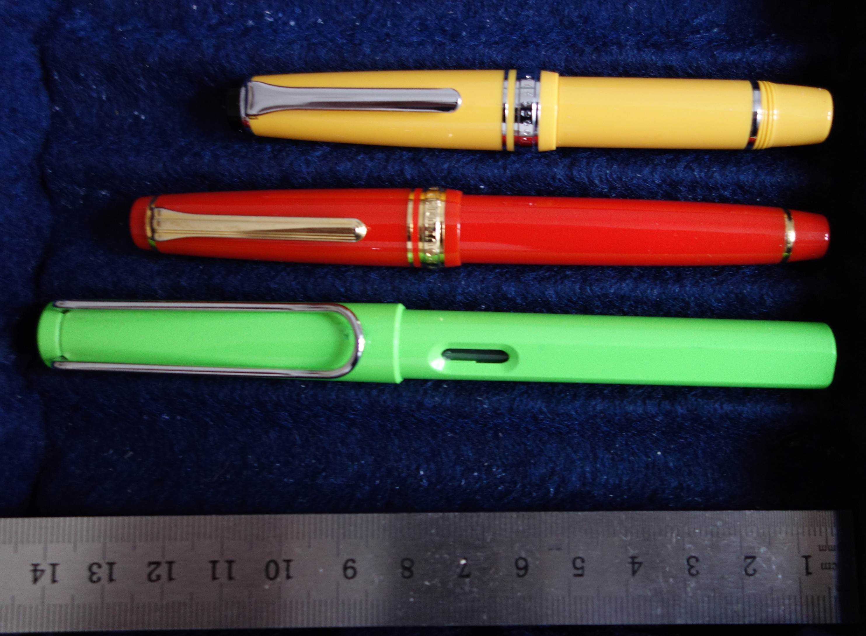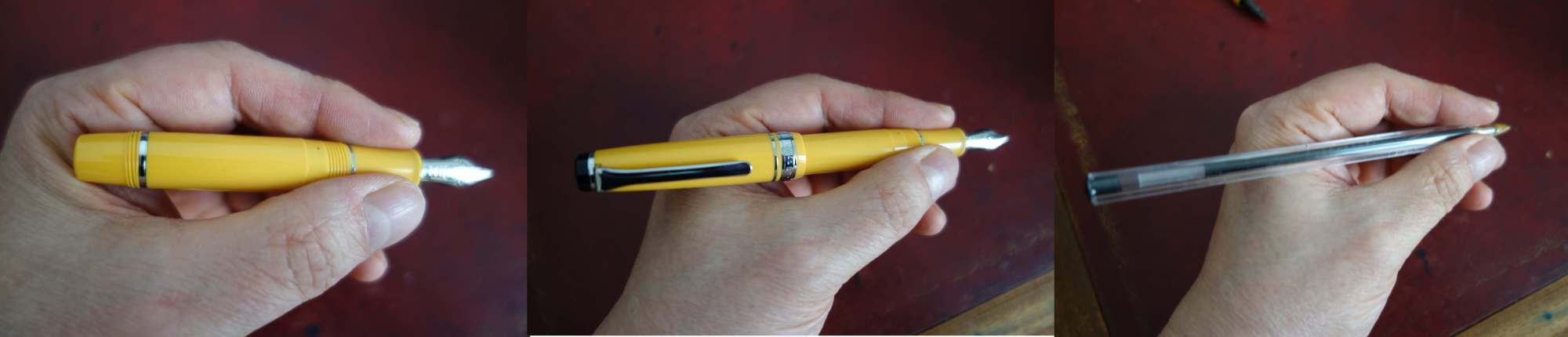 Impugnatura: per mani grandi diventa impossibile senza avere il cappuccio postato, che per altro si avvita su una filettatura a vari imbocchi. Un confronto con altre penne: Non ho aggiunto una prova di scrittura in quanto il pennino-gruppo scrittura è un Sailor infatti qui l'ho montato sulla Sailor pro Gear rossa