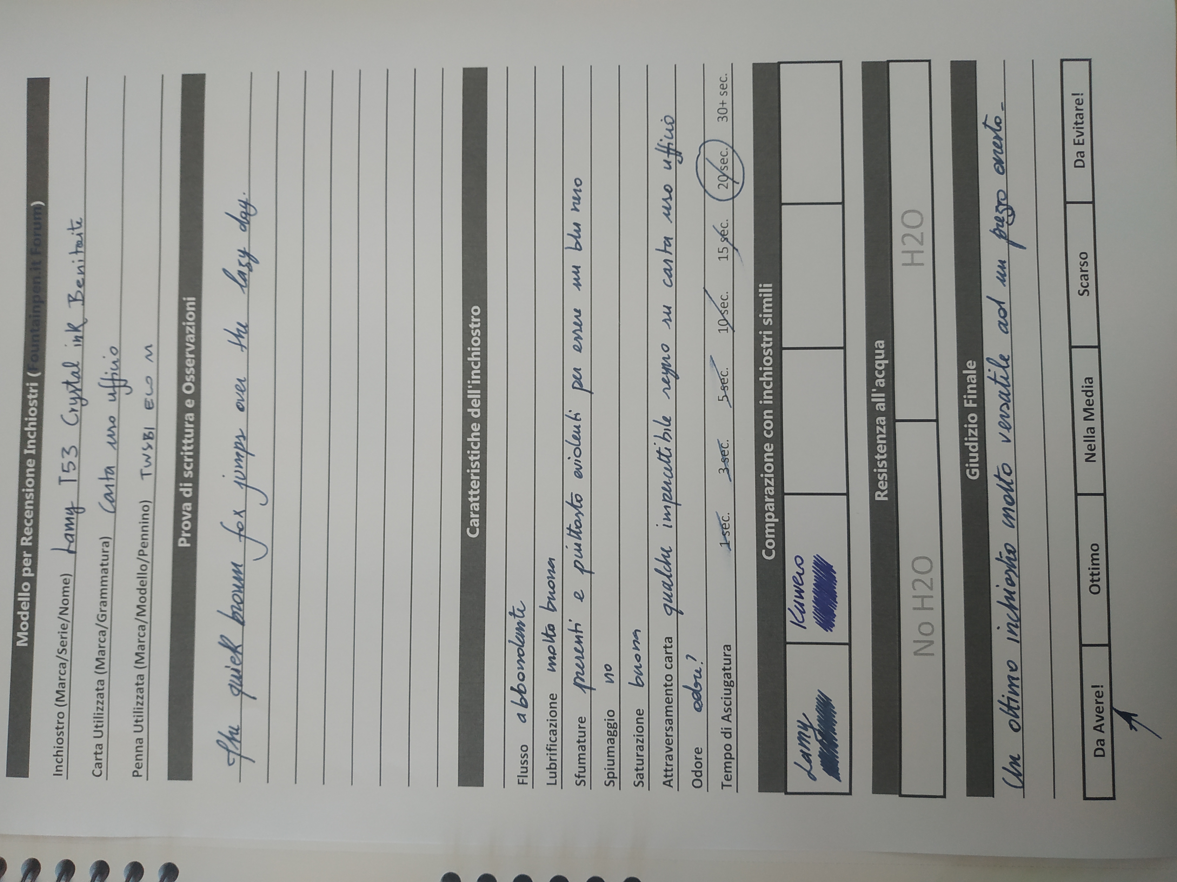 L’inchiostro del nostro caso è un blu nero dichiarato come document proof: ho fatto dei test specifici a parte ed effettivamente è molto resistente ( l'ho usato per fare uno schizzo ad acquerello e dopo diverse lavature di colore non ha fatto una piega.