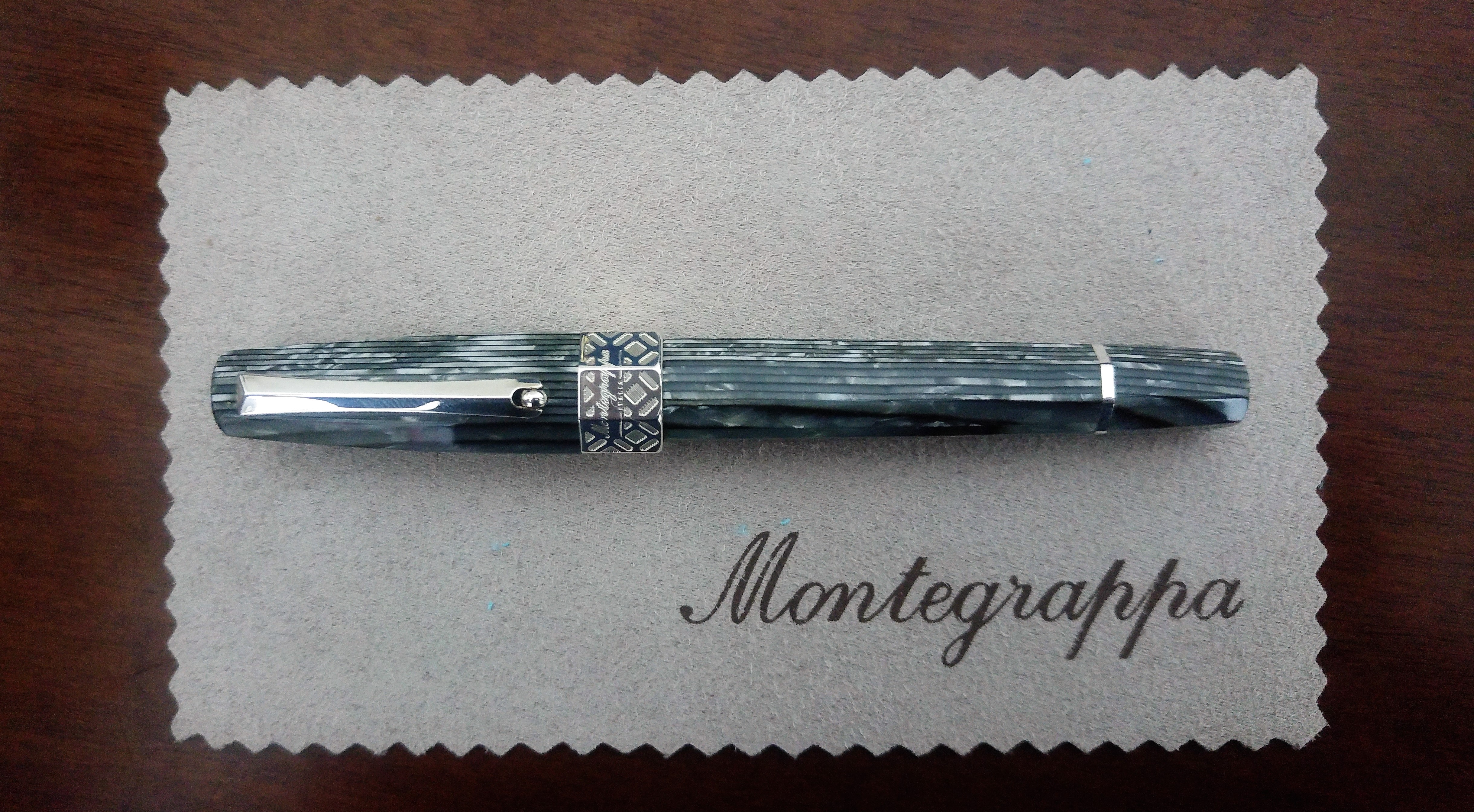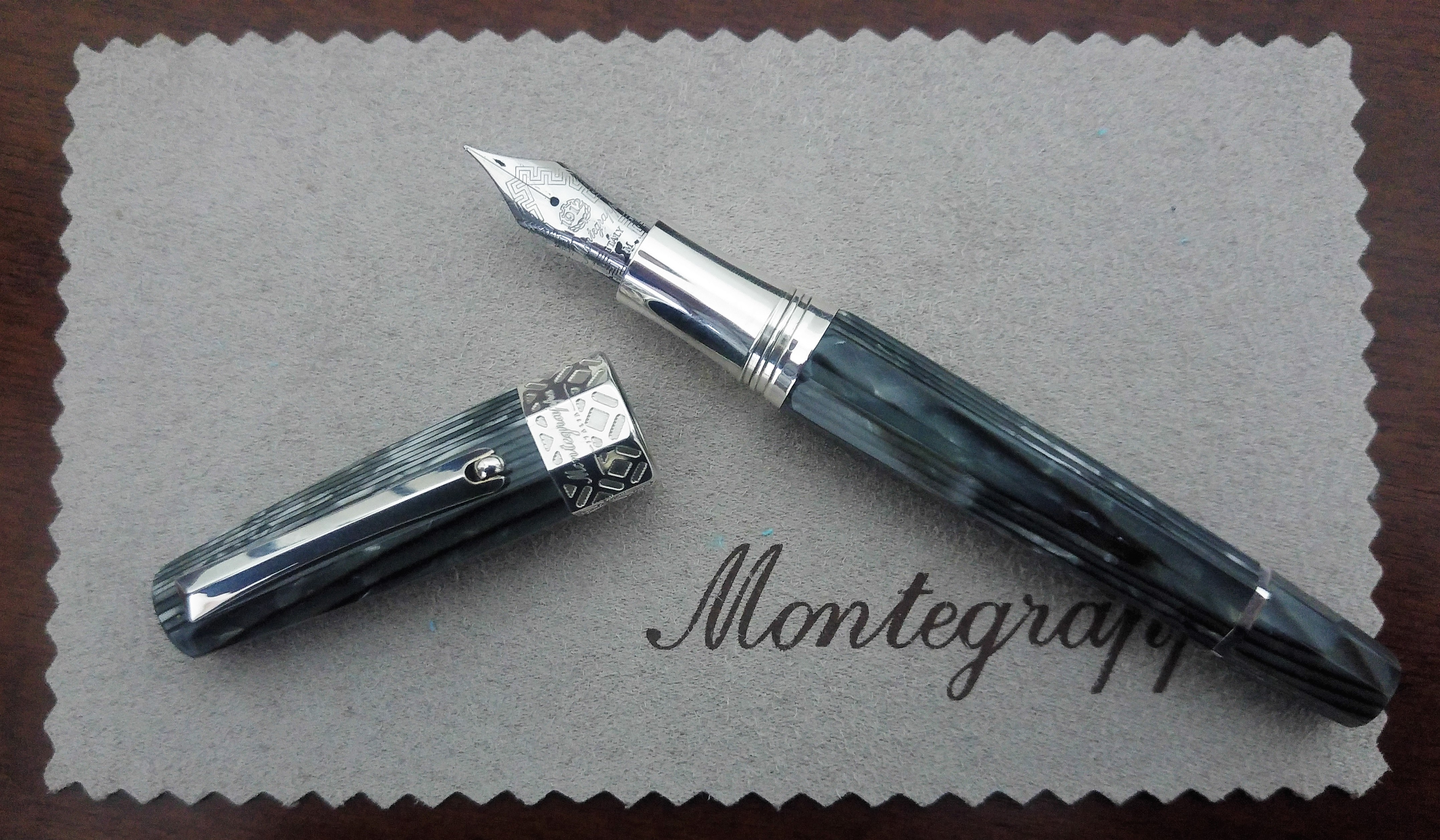 È una penna che coniuga la sinuosità della linea del fusto e del cappuccio con la sfaccettatura a otto facce, una penna dalle proporzioni perfetta, risultato di un attento e continuo progresso fatto da Montegrappa a iniziare dalla Classica. La celluloide “linee brillanti” le dona una eleganza senza tempo e per quanto si possa tentare di ritrarlo la si può essere apprezzare solo dal vivo; un materiale vivo che cambia di faccia in faccia passando da un effetto arco ad un effetto striato che è prima ricco di sottili strisce di grigio tendente all’argento per poi richiamare di nuovo un effetto arco. Nella mia collezione, trovo essere la sola penna in grado di rivaleggiare per estetica con la OMAS Paragon Arco Brown.