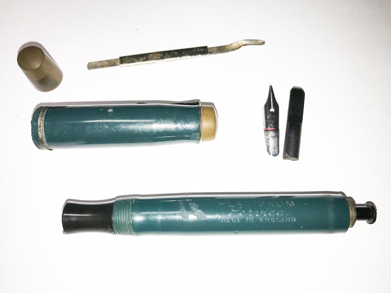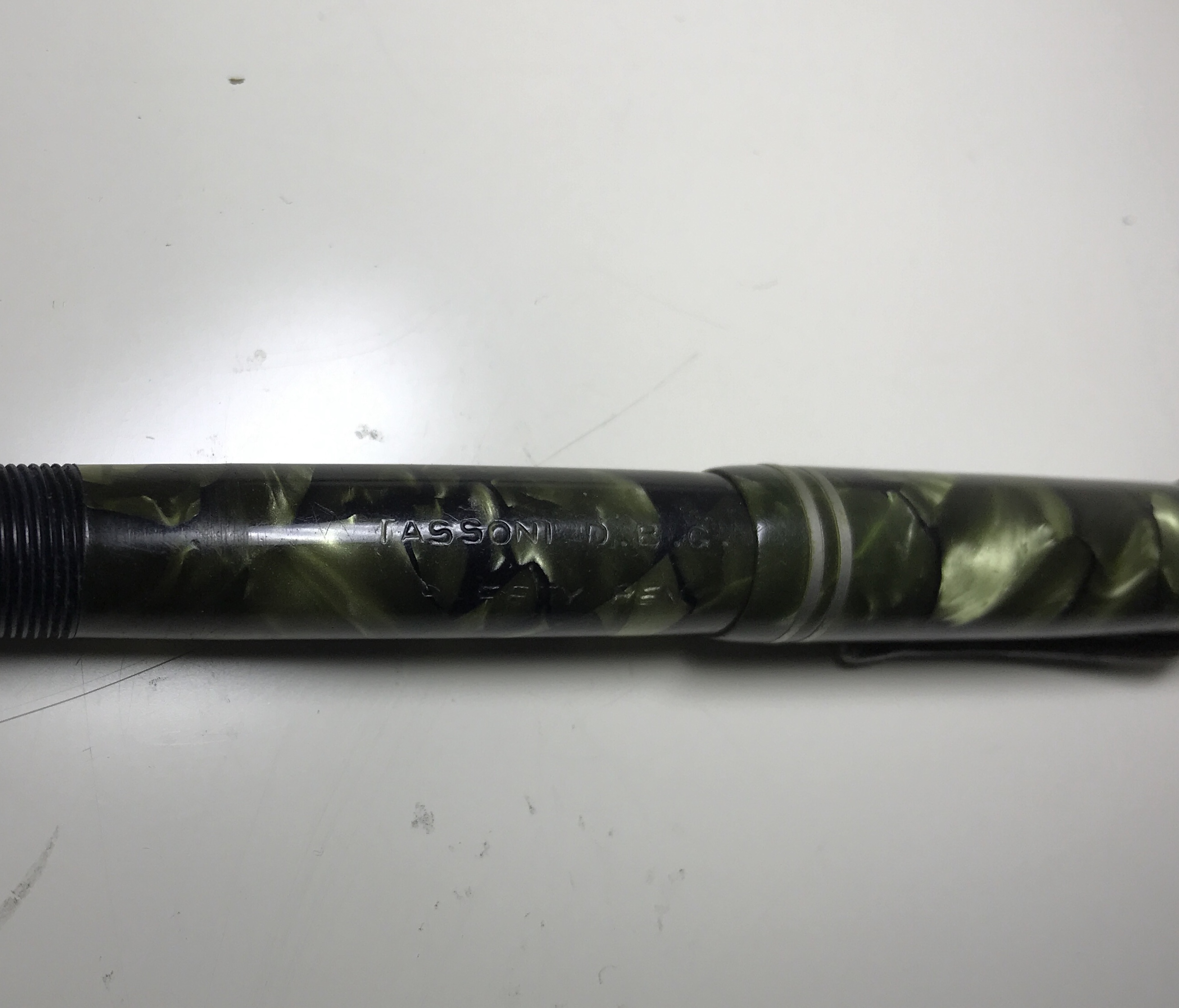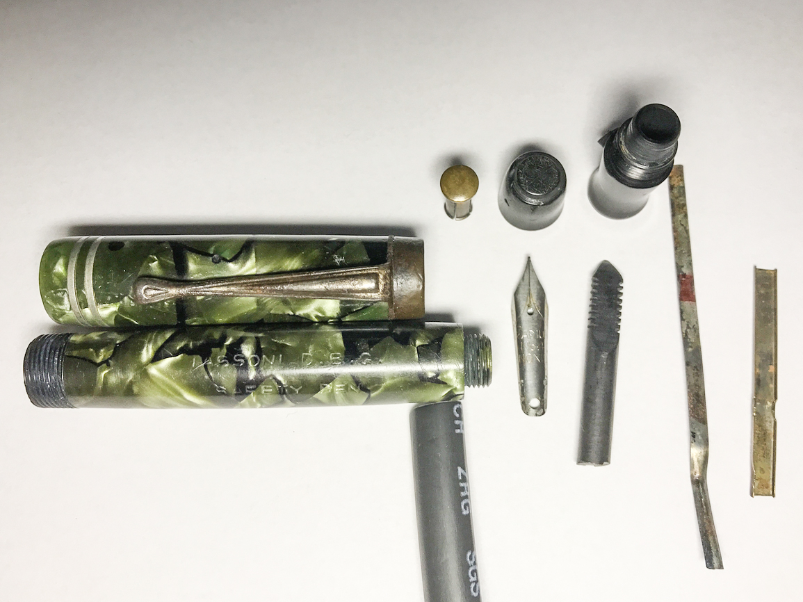 Questi i miei primi esperimenti di restauro. Due penne trovate da un rigattiere per pochi spiccioli. Quella verde della Platignum (si legge sul fusto) si è un po' deformata a contato con l'acqua (ho letto qui sul forum che succede alla galalite, ma lho letto solo dopo: ben mi sta!) quindi penso di non farne niente. Su quella verde marmorizzata pensavo di provare il mio primo intervento. Prima di tutto vi chiedo lumi sulla marca: c'è scritto I ASSONI D.B.G. Safety pen (ma non è safety, è a pulsante), in rete non ho trovato nulla su questa marca. Come vedete l'ho smontata e pulita seguendo le istruzioni del wiki (non sono riuscito a smontare la clip, ipotizzando che sia avvitata, non c'è verso di girarla): il sacchetto ovviamente è andato in briciole quindi mi si prospettano varie soluzioni. Procurarmi un nuovo sacchetto (strada lunga, falro venire dall'estero); autocostruirlo con una guaina per cavi elettrici come quella che vedete in basso perpendicolare al fusto (strada rapida e semplice); costruire una frankesteinpen adattando una cartuccia vuota (non sarebbe più un apenna a pulsante ma potrei comunque usarla).
