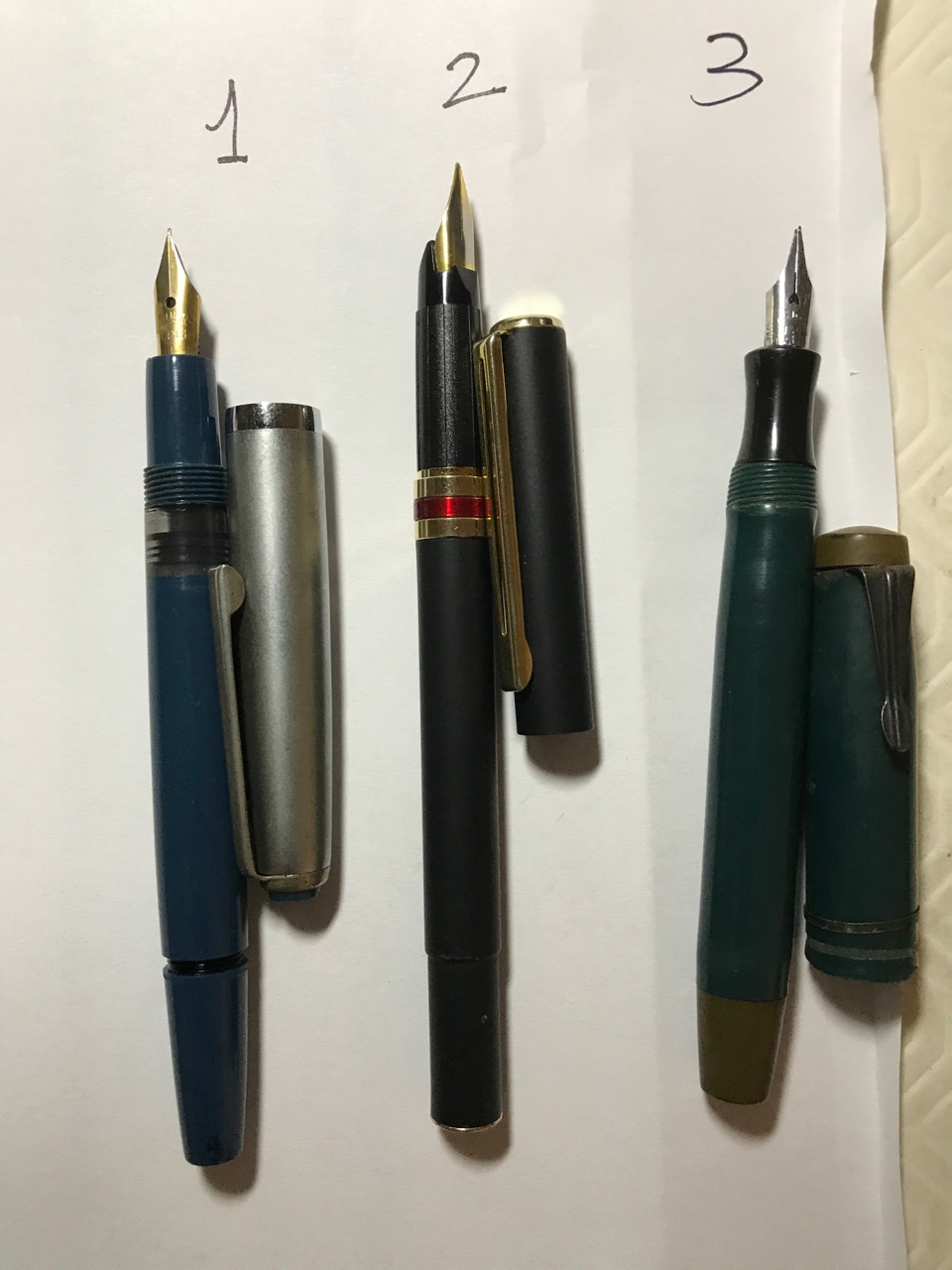 Queste le ultime acquisizioni dal mercatino: la n. 1 appartine al genere che è la mia passione: le scolastiche a stantuffo tipo Pelikan degli anni Sessanta. Non ha l'indicazione di nessuna marca, dunque anonima (made in Germany?). La 2 anche lei nessuna marca, sembrerebbe tipo Waterman. Qualcuno la riconosce? La 3 è la stessa che ho postato nella sezione Riparazioni, in galalite, un po' deformata, con un rebbo del pennino rotto (ha inciso sul fusto: Platignum. Made in England): anni Trenta?
