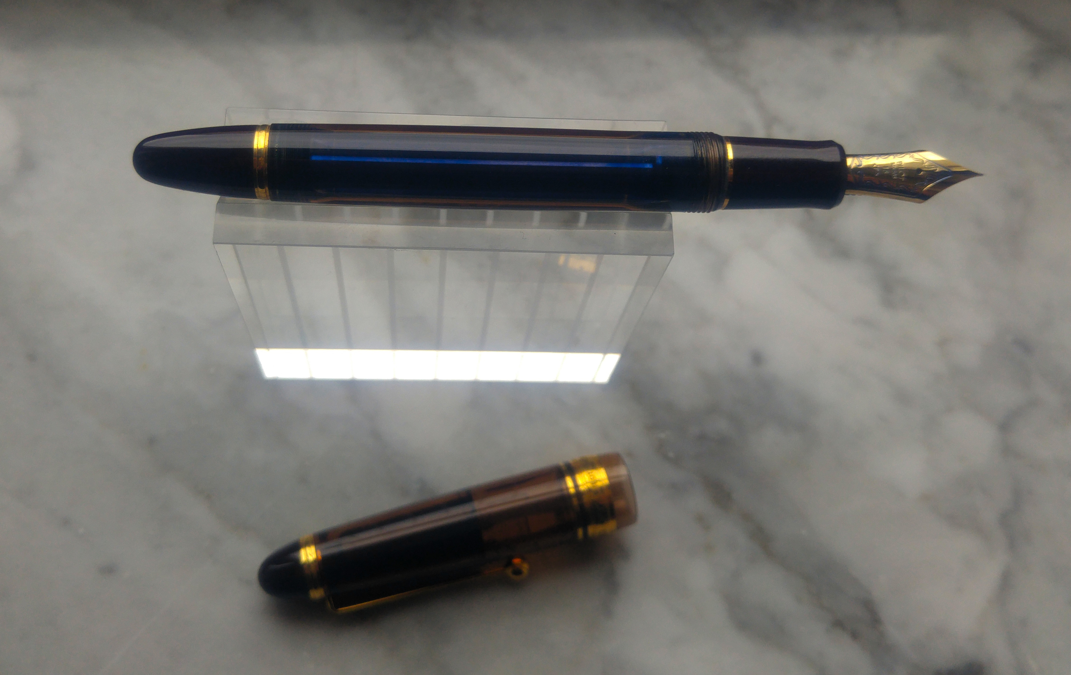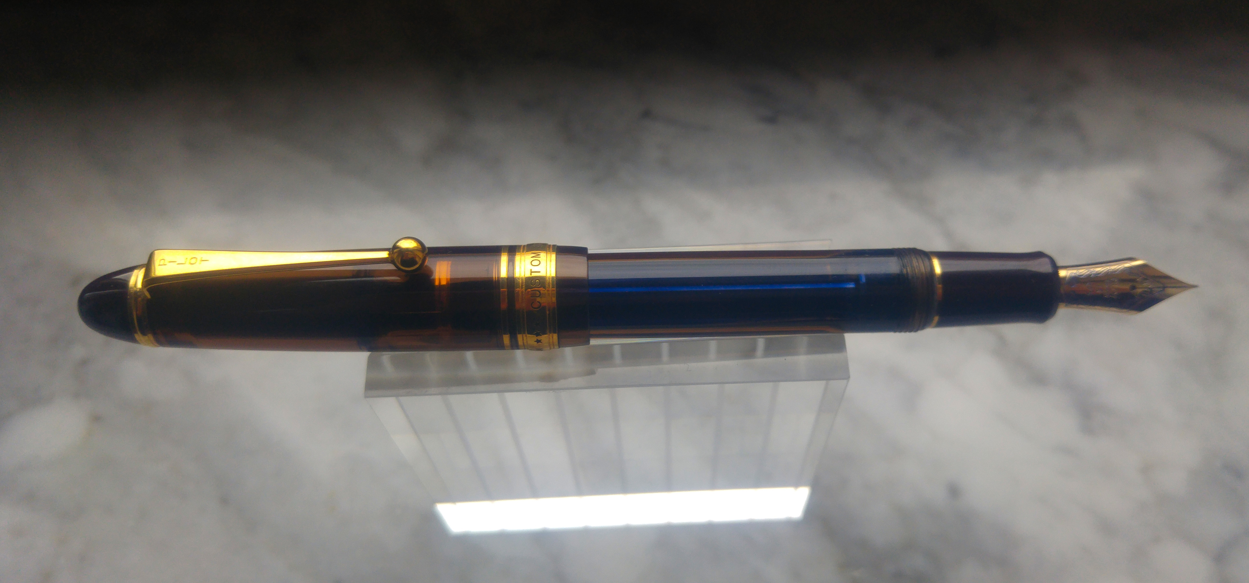 Un mesetto fa sono incappato in questa Pilot Custom 823 e viste le recensioni generalmente positive l’ho presa seppur con qualche riserva. Appena arrivata invece mi ha immediatamente colpito positivamente per la sua estetica, materiali e dimensioni. La 823 non è una penna piccola, è leggermente più lunga di una 146, penna a cui direi che i designer di Pilot si sono ispirati. La prima cosa che mi ha colpito è stato il materiale, finalmente una penna che da una sensazione di solidità ed un acrilico di una bella tonalità marrone trasparente, poi il pennino molto bello e di dimensioni generose, più grande del pennino della 146.