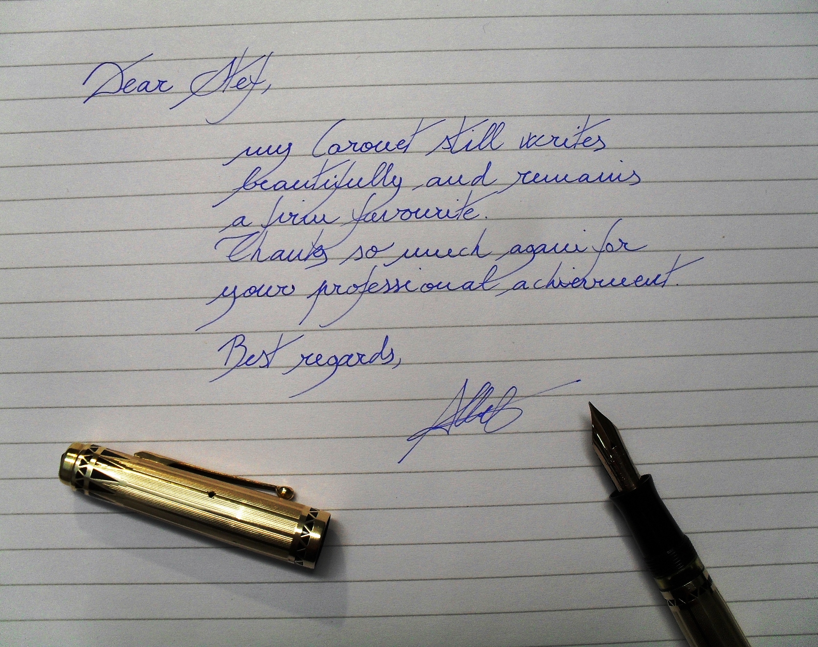 Si tratta naturalmente d’una stilografica che è in grado d’impressionare e che, per la sua appariscenza, deve piacere. Fra le “gold filled” rimane, a mio parere, una delle più eleganti ed affascinanti.