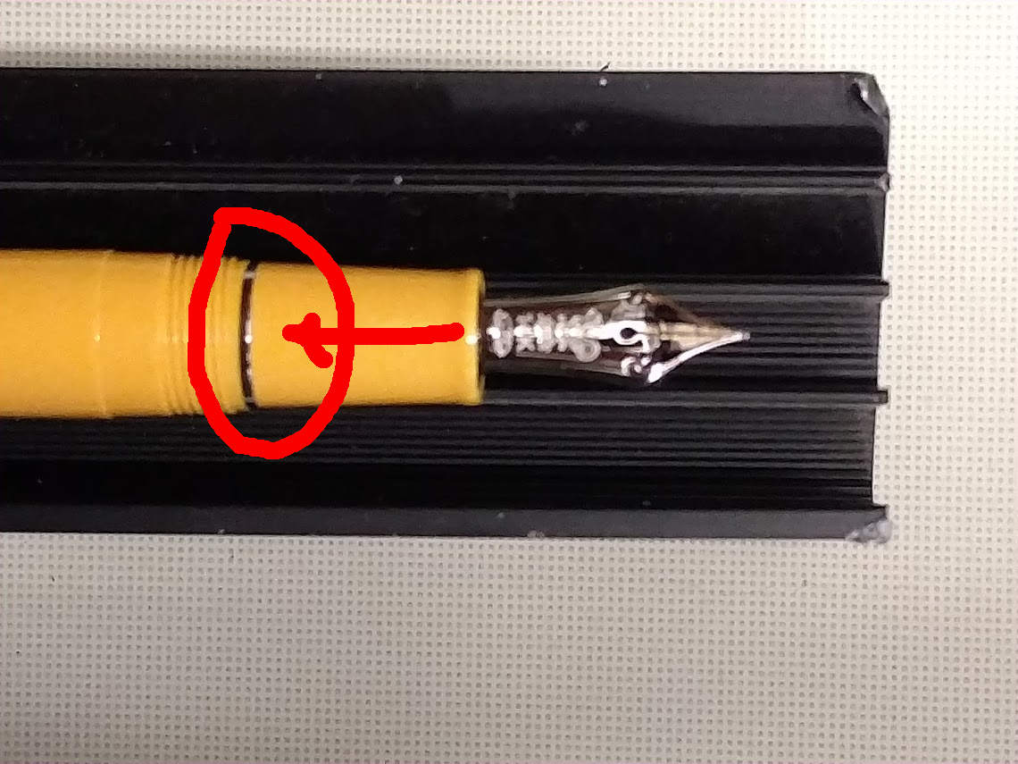 Stasera la mia nagasawa penstyle ha iniziato a perdere inchiostro tra la parte di plastica gialla e la filettatura , dove ho fatto la freccia rossa.